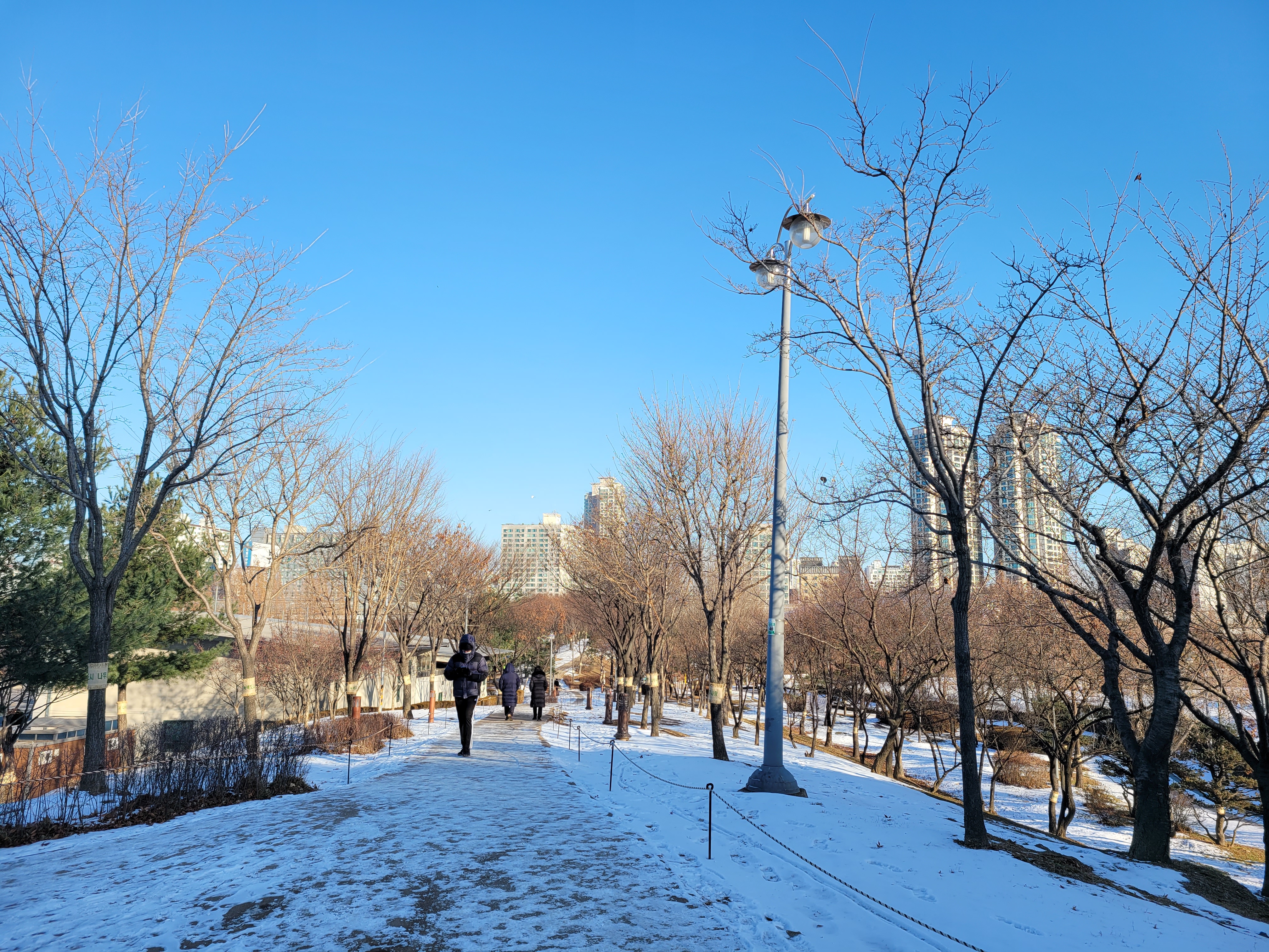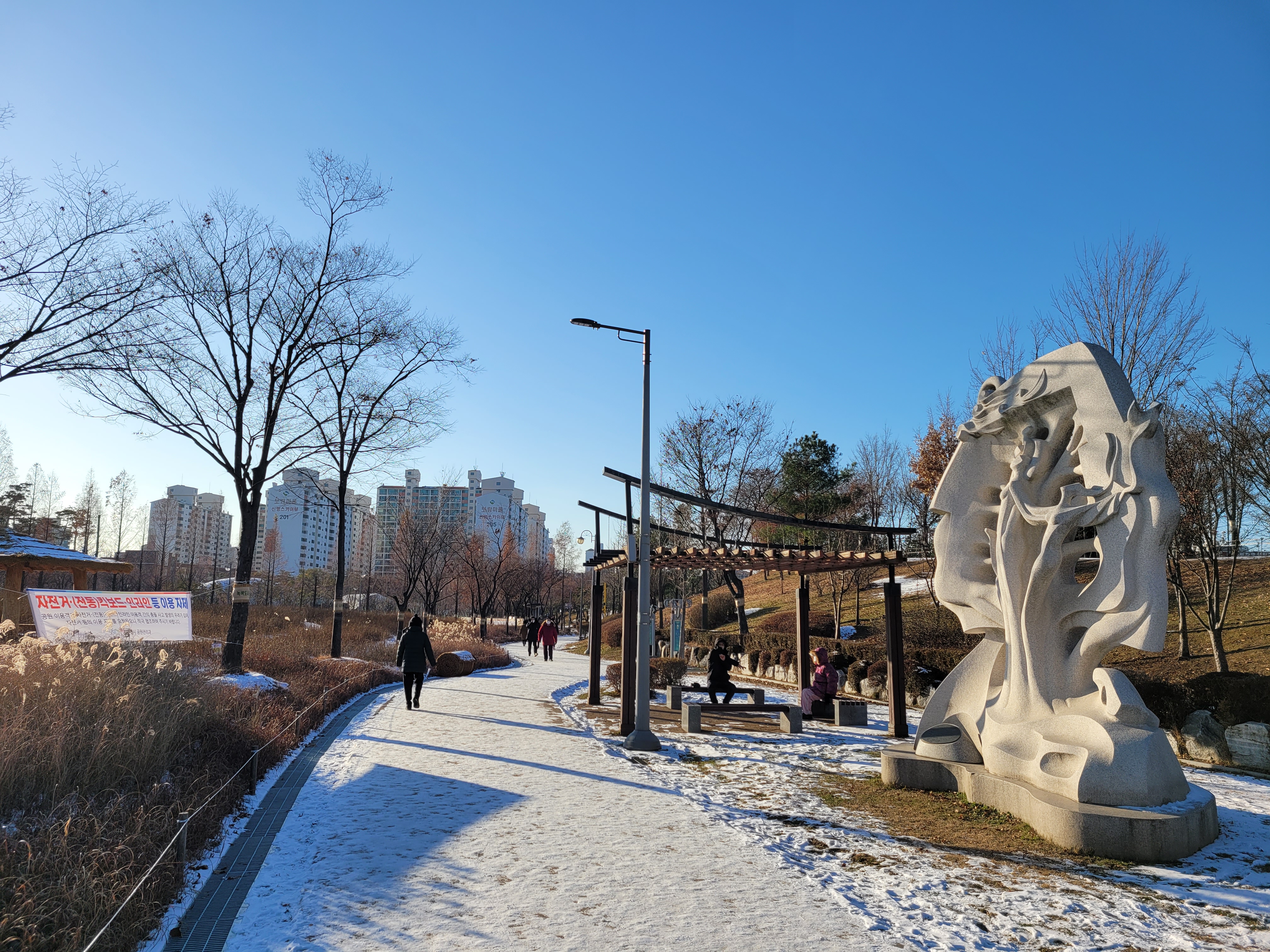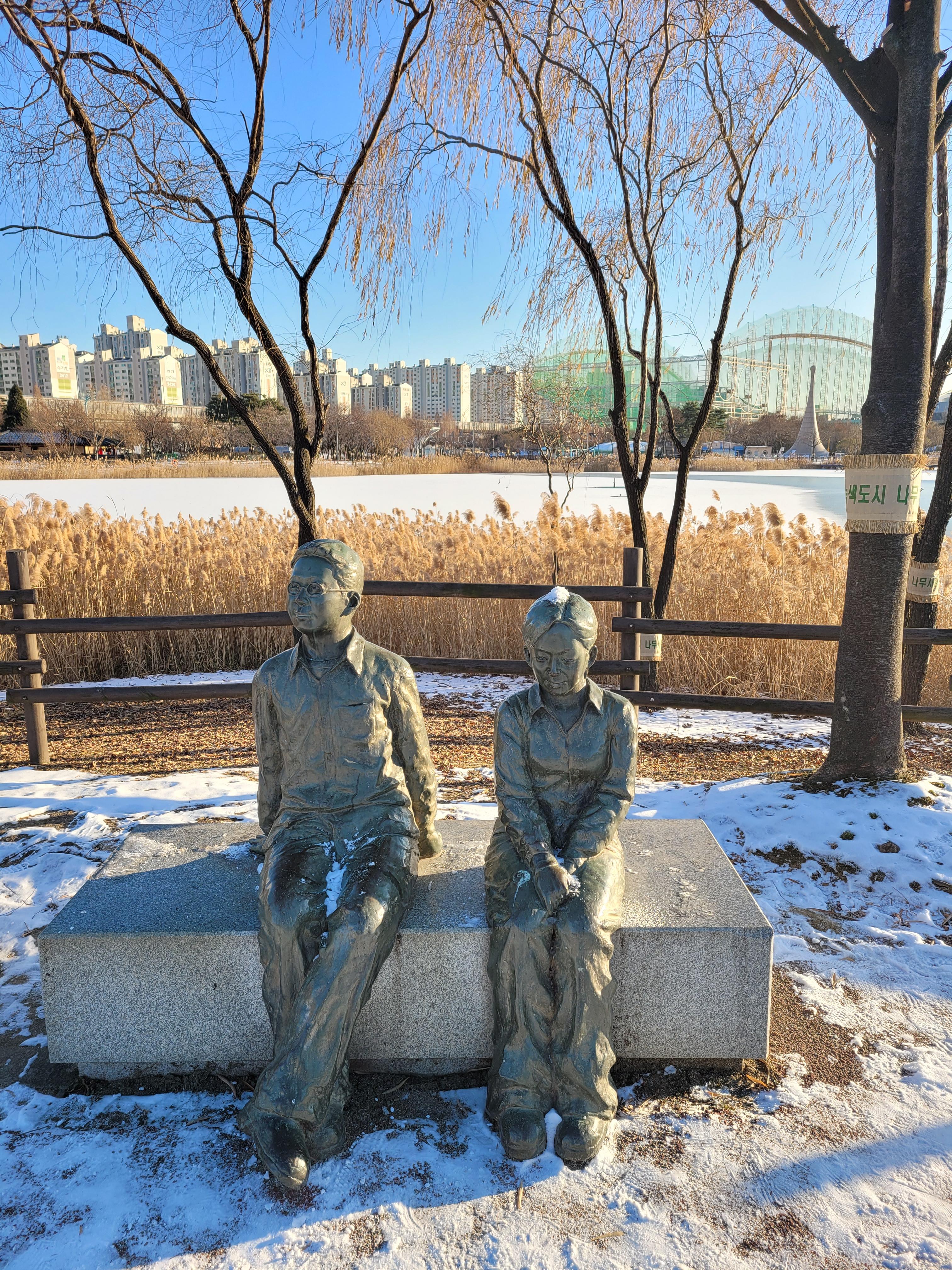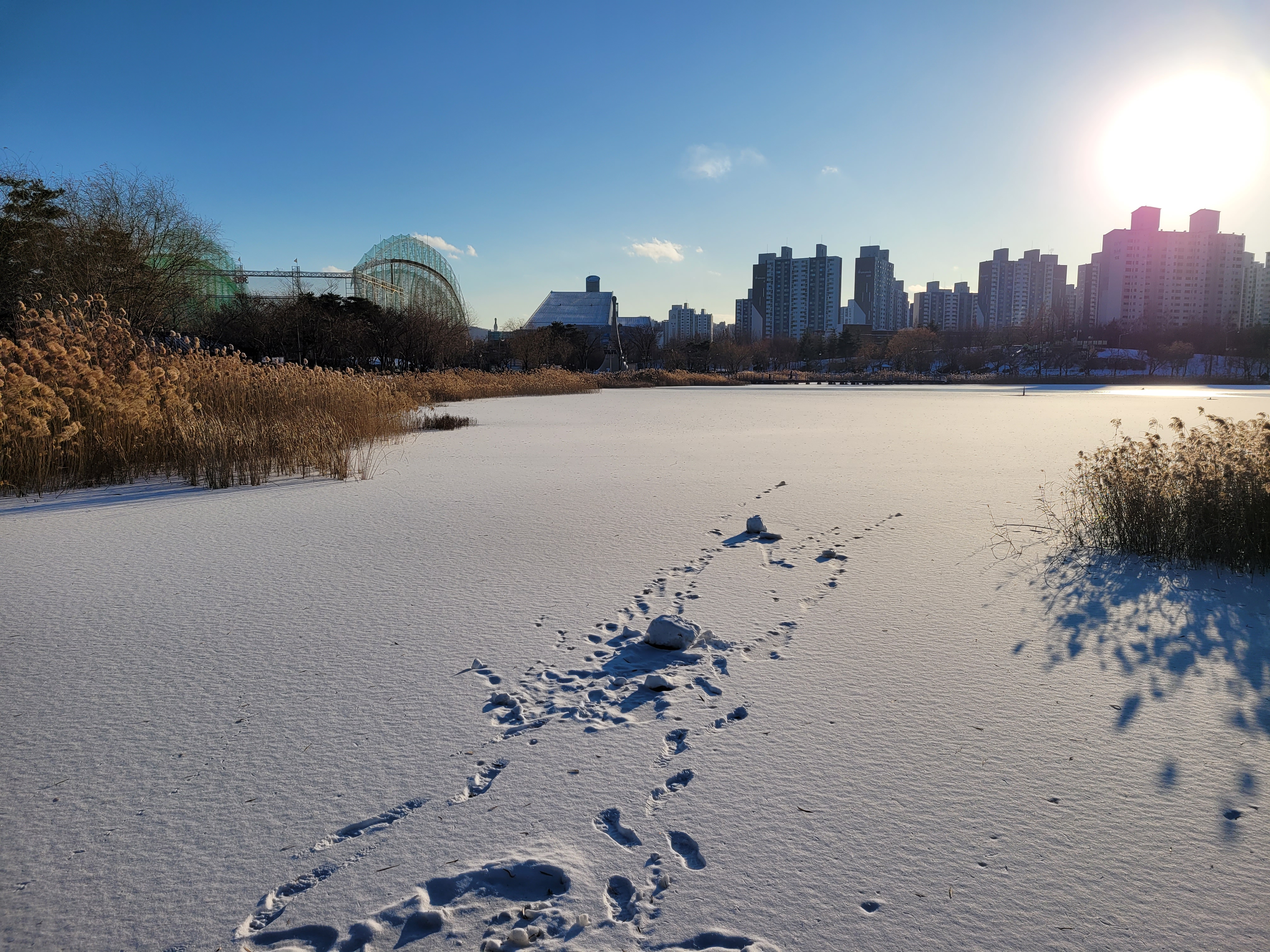 특히 호수공원 중앙에 있는 호수도 완전히 꽁꽁 얼어붙었고요.