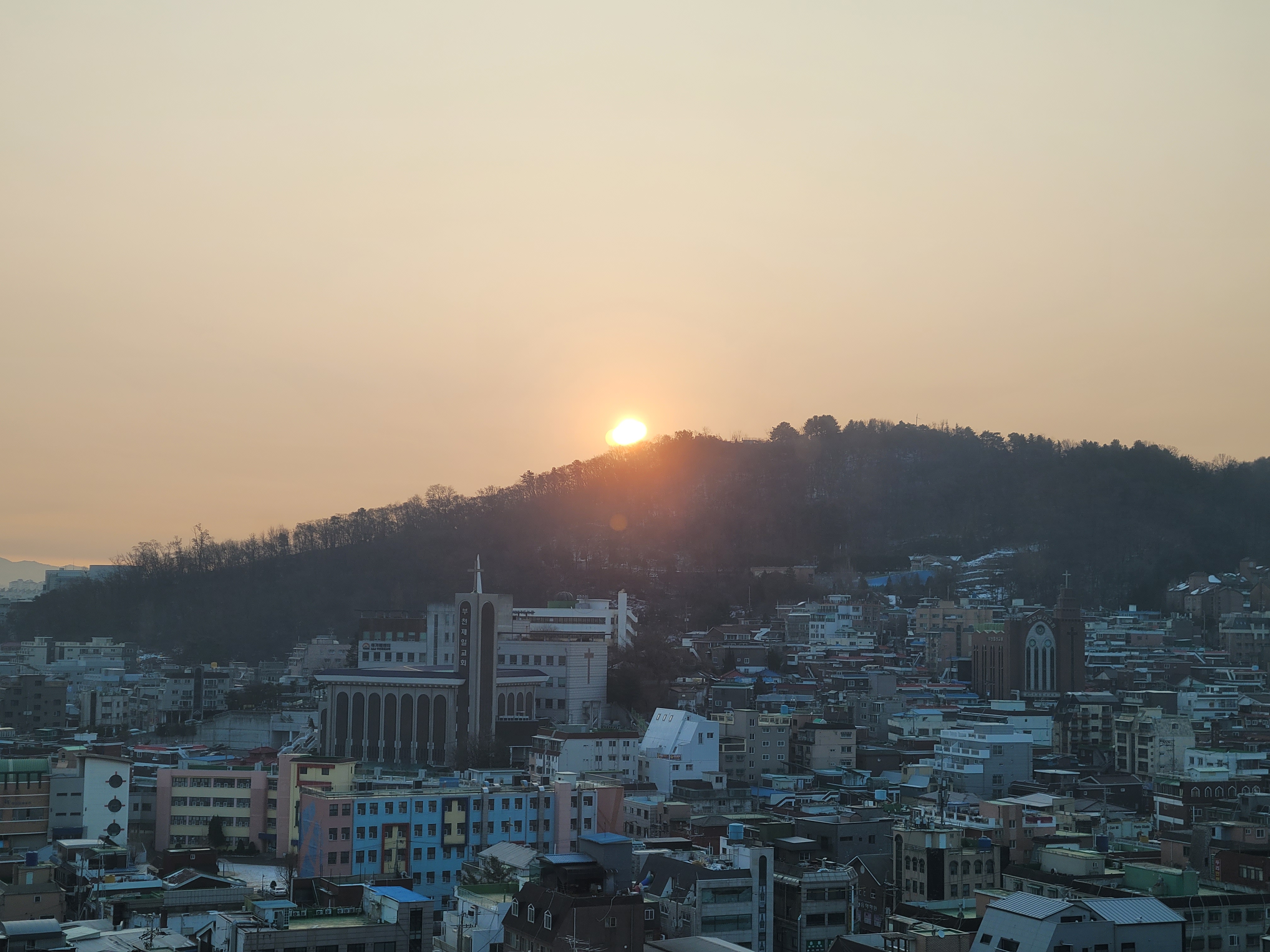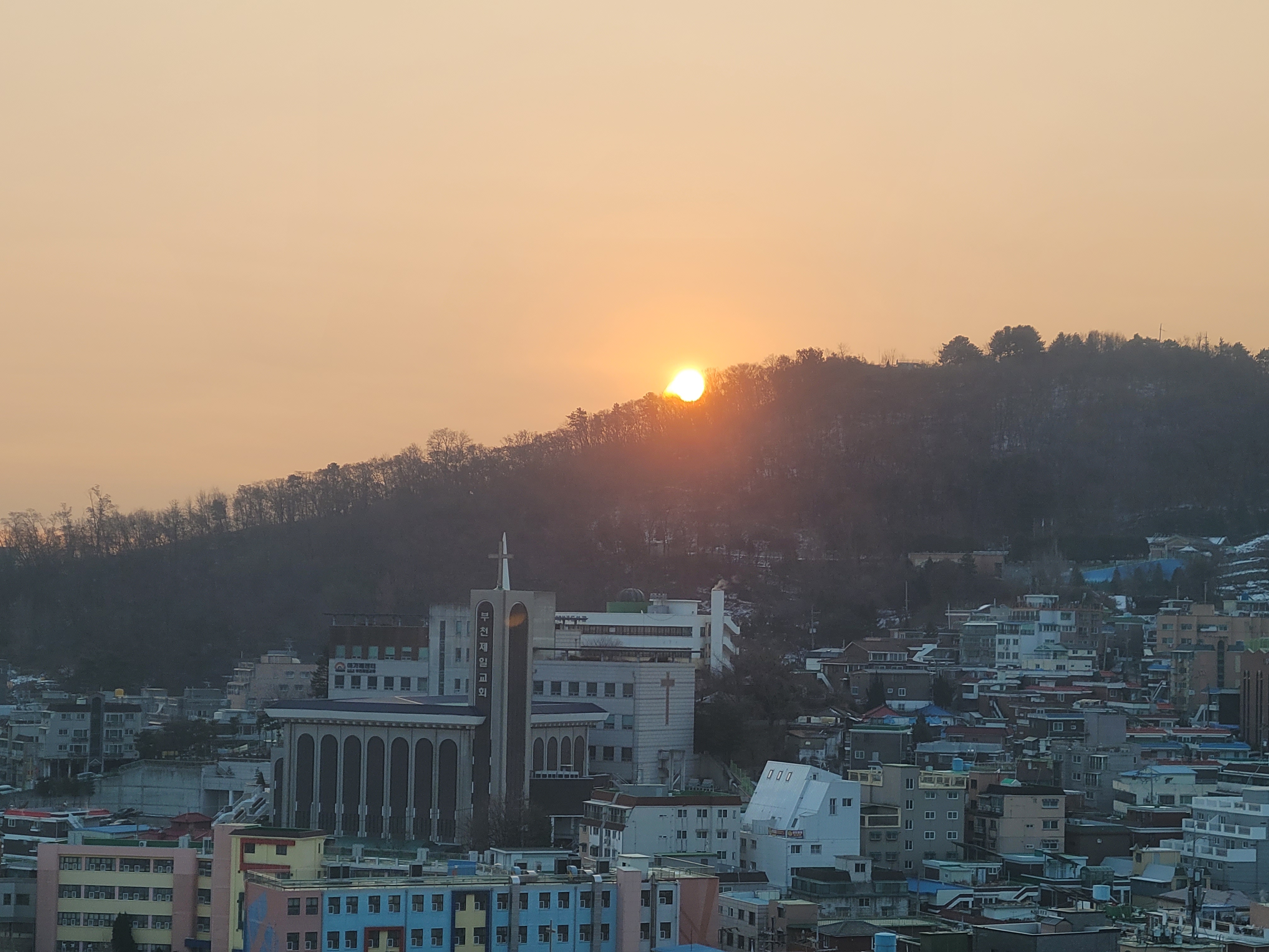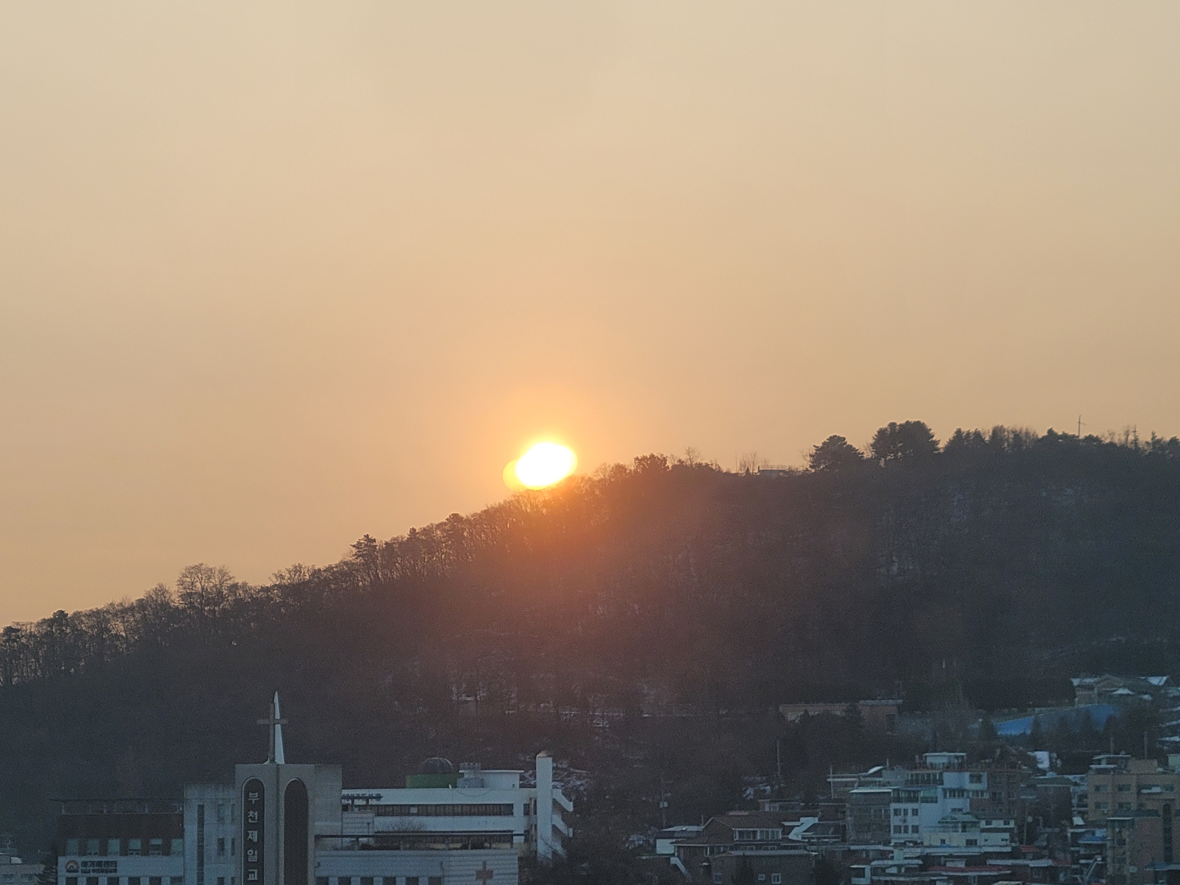 오늘 집에서 아침에 눈떠서 창밖을 보니까 산 밑에서 일출이 막 뜨고 있었더라고요.
