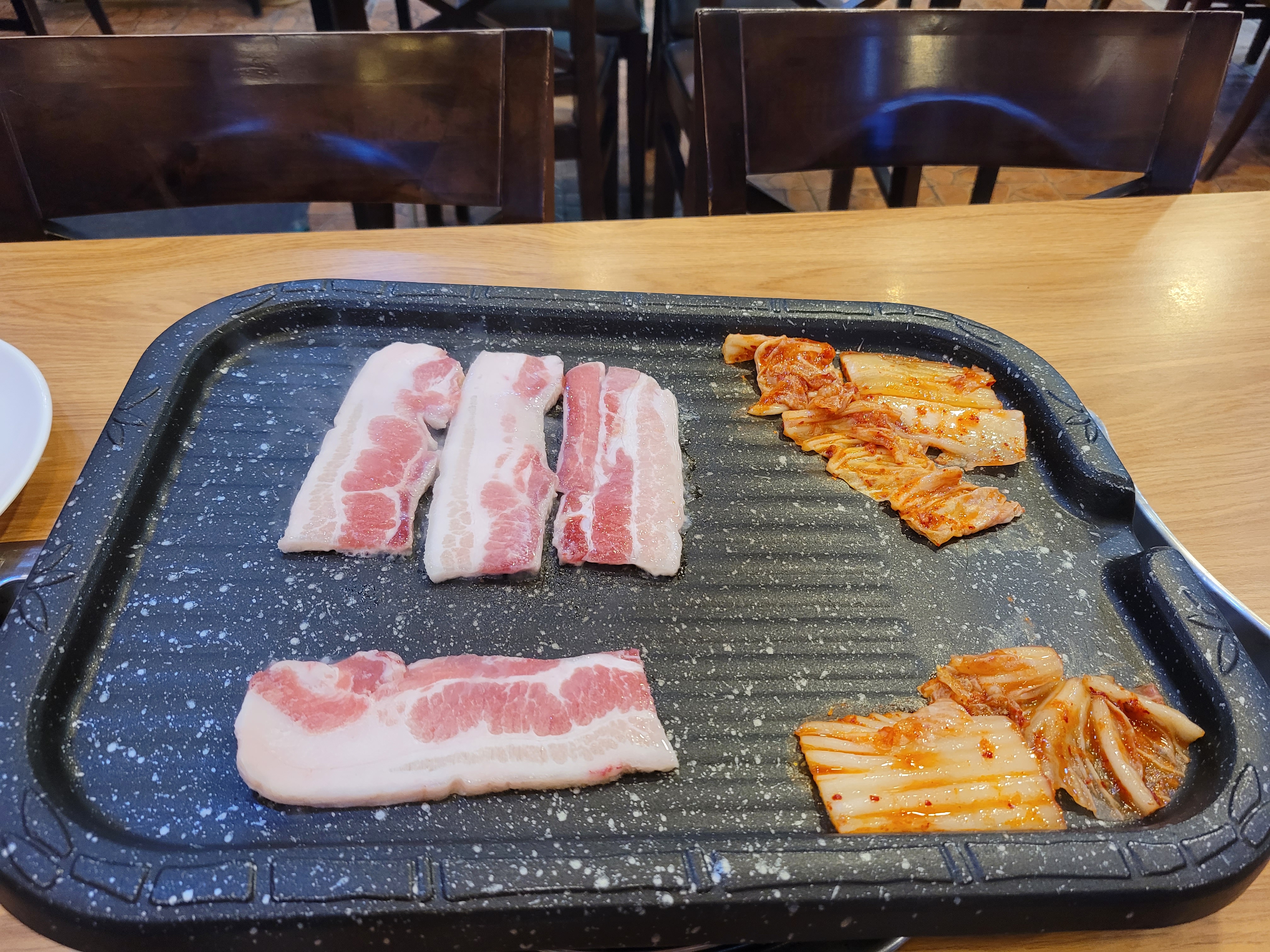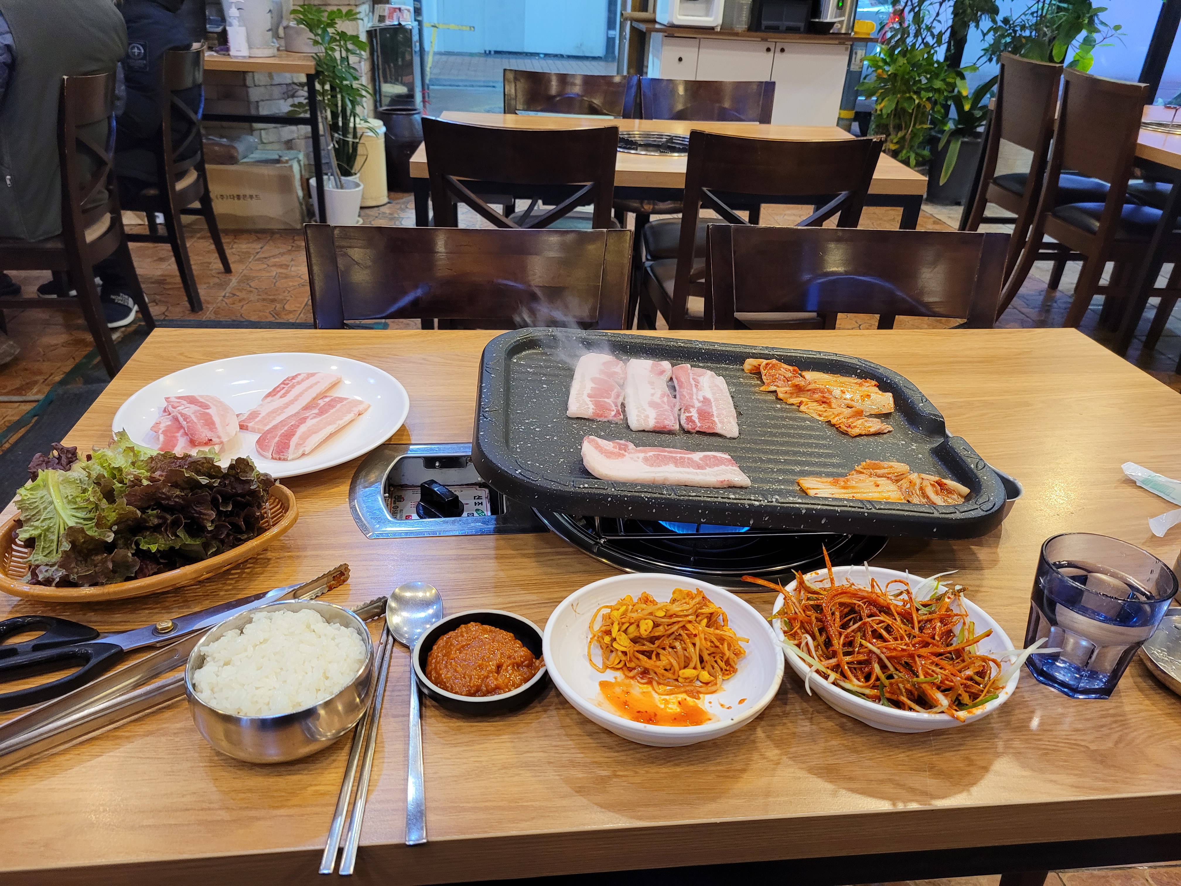 제가 새로 이사한 오피스텔 근처 삼겹살집에서 냉동삼겹살 300g과 된장찌개 공기밥을 먹었습니다.