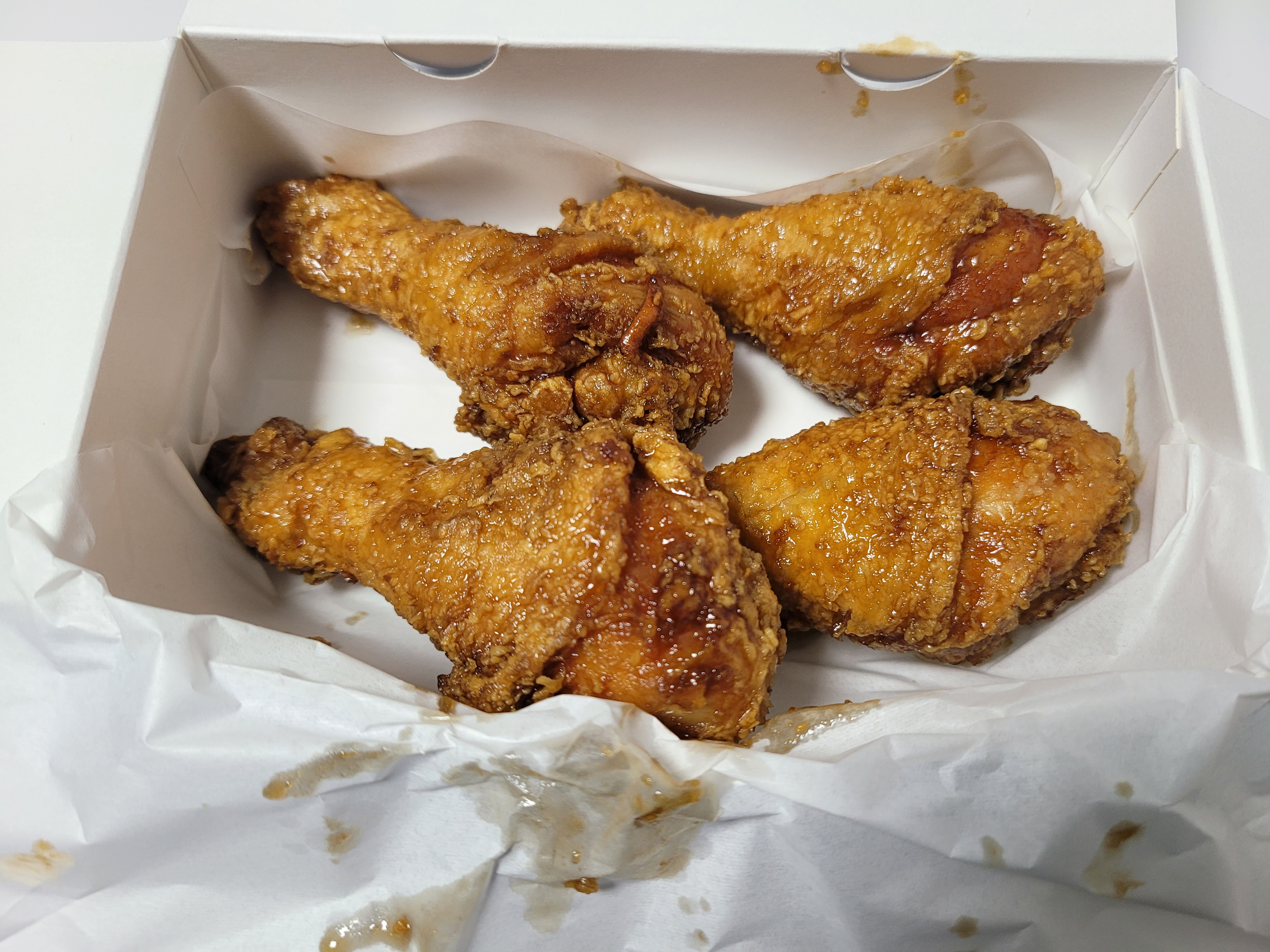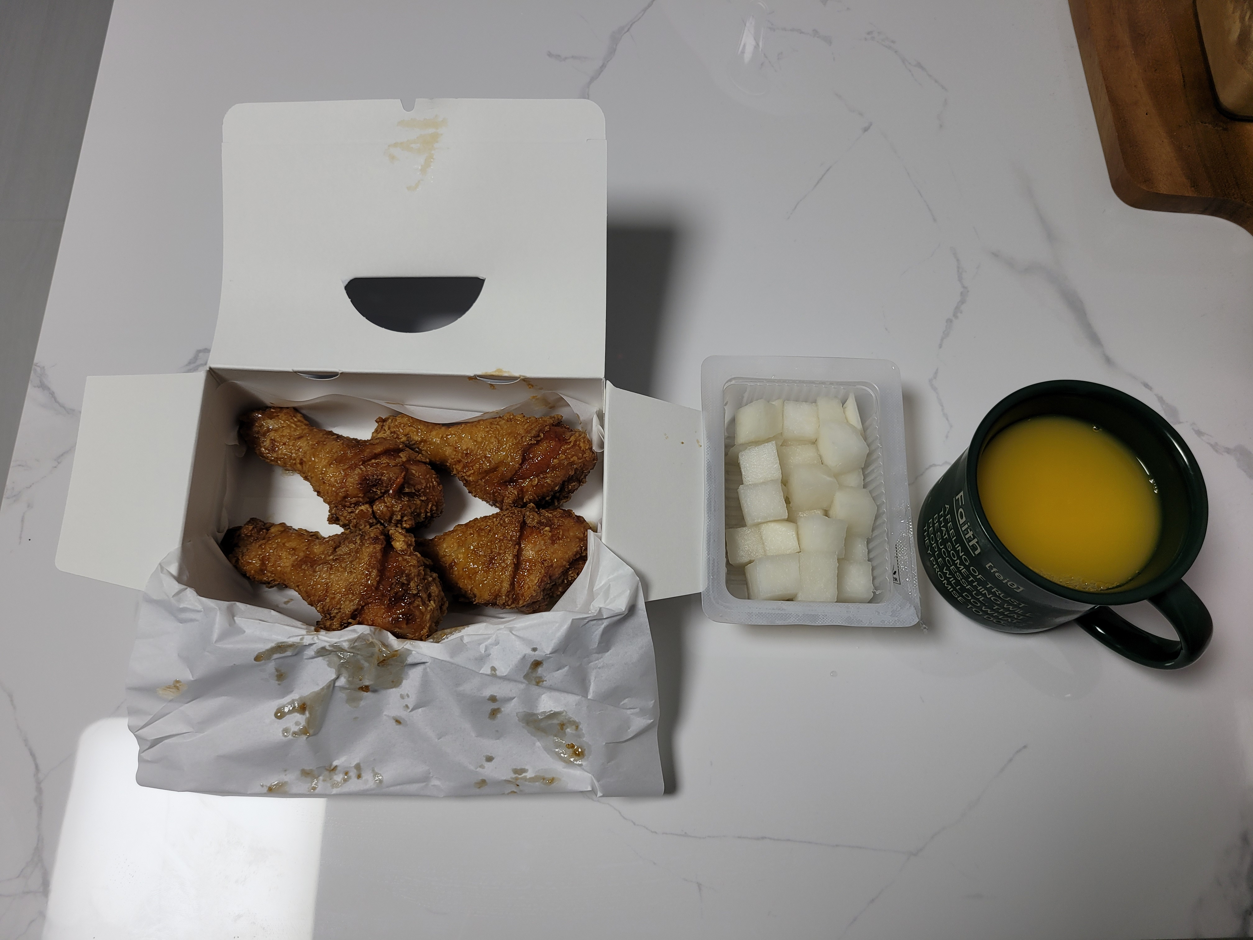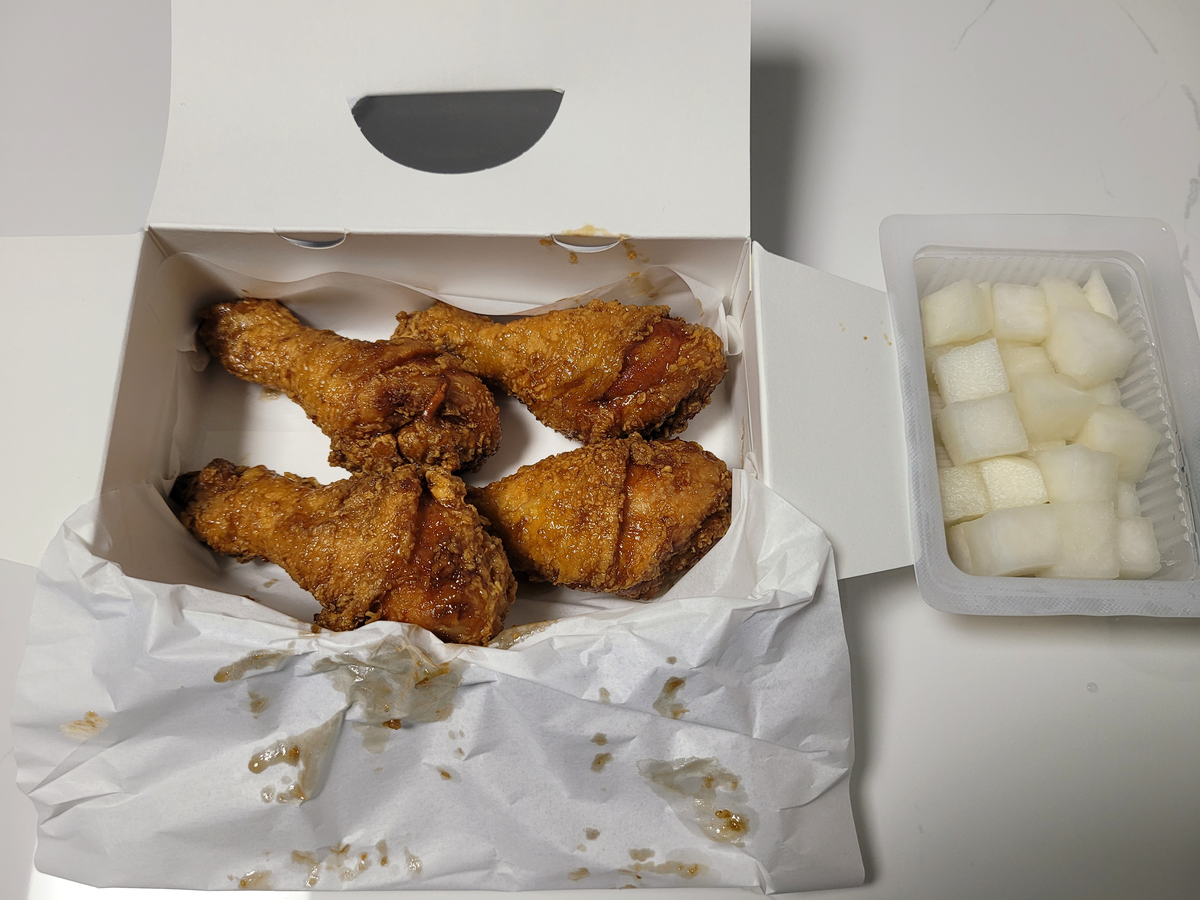 오부장치킨집에서 닭다리 4조각 사서 야식으로 맛있게 먹었습니다 ㅎㅎㅎ