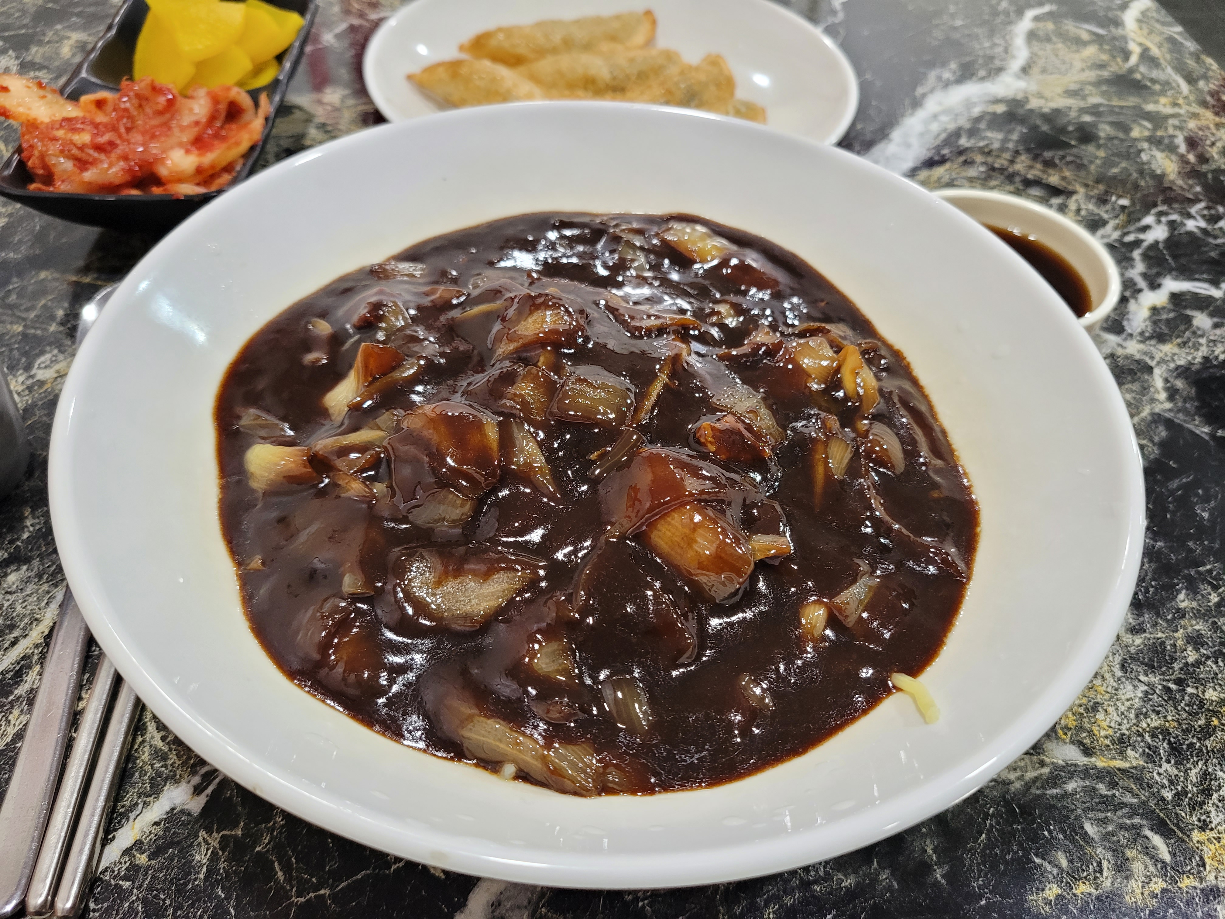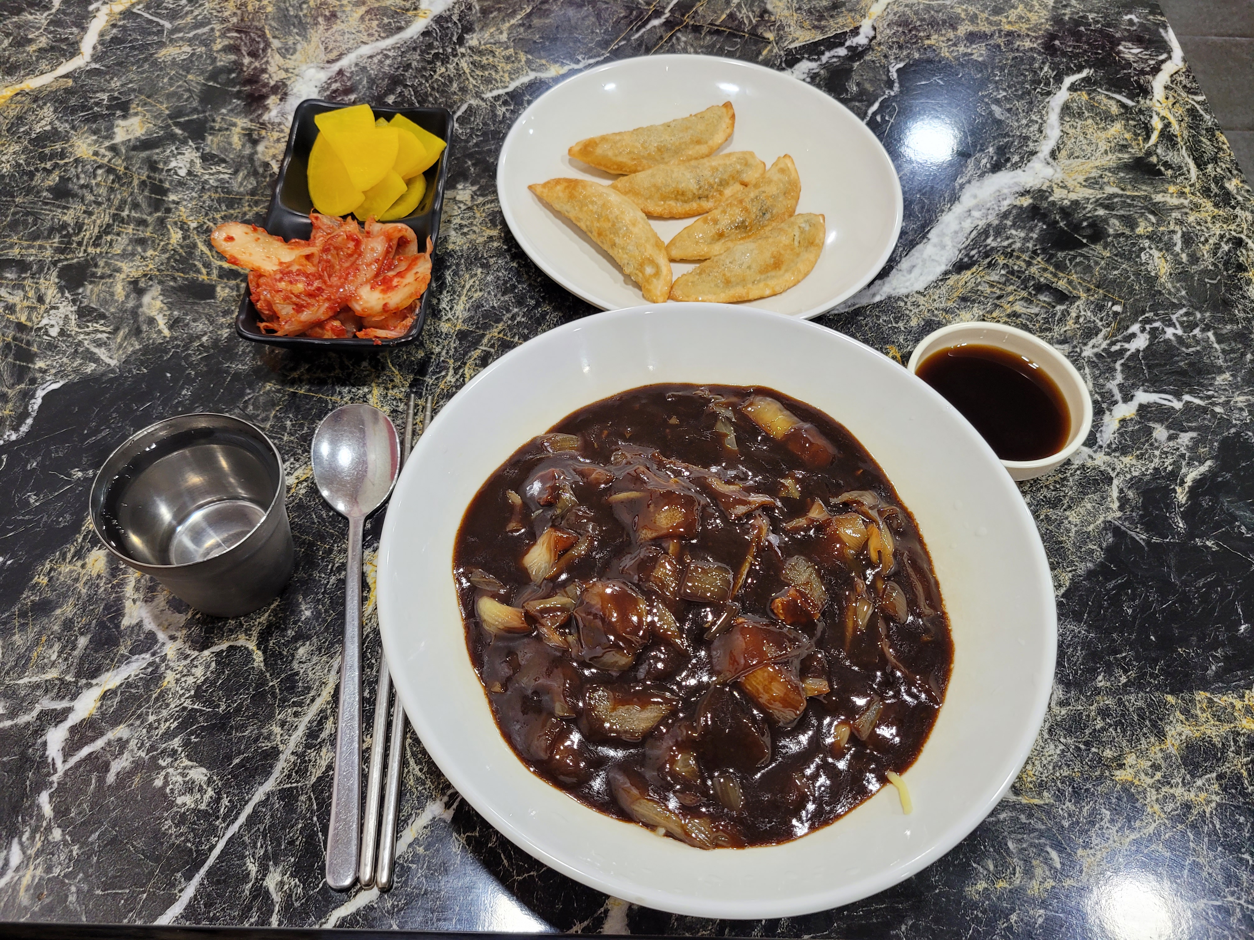짜장면 곱배기에 군만두를 시켜서 먹었습니다.