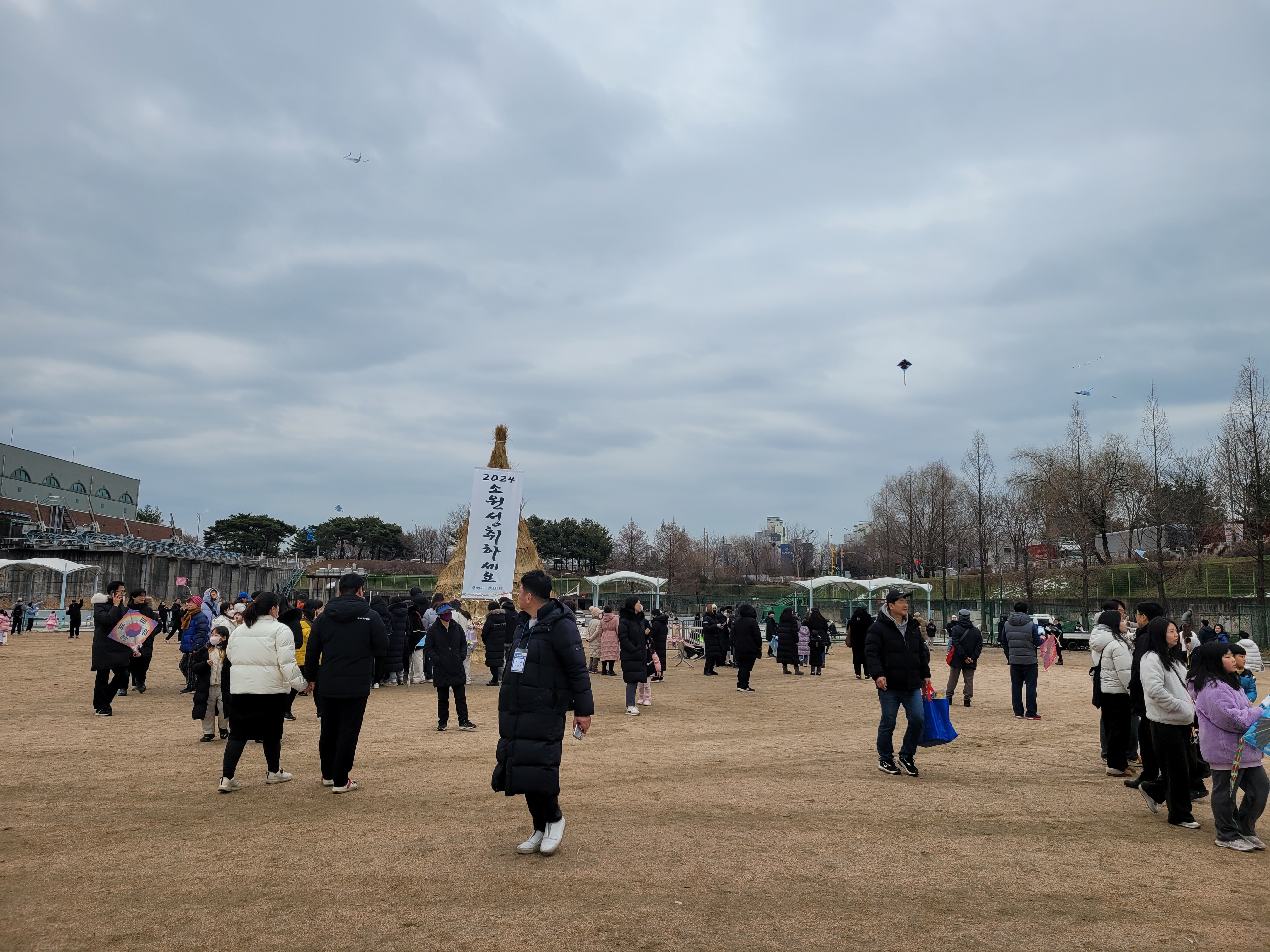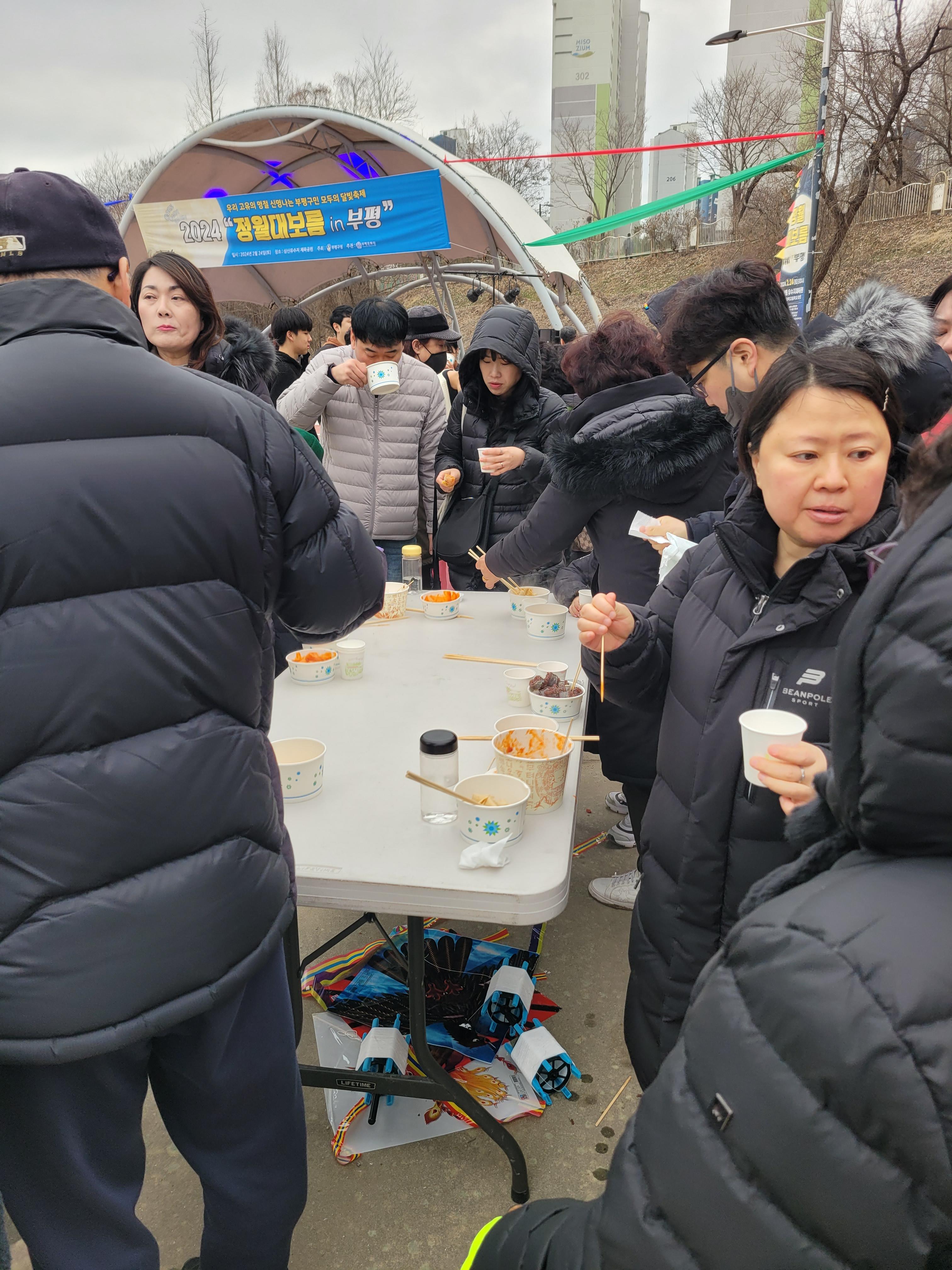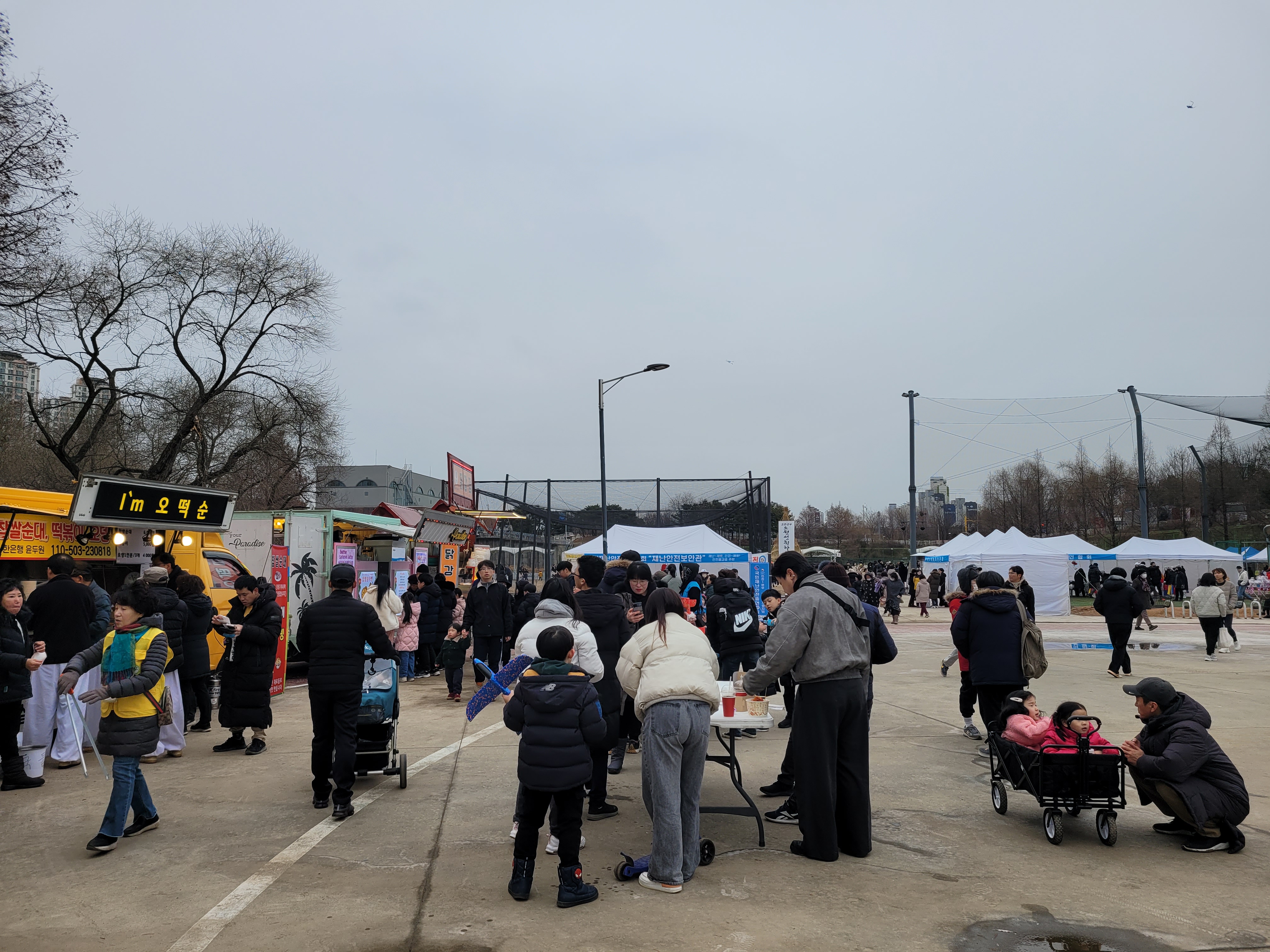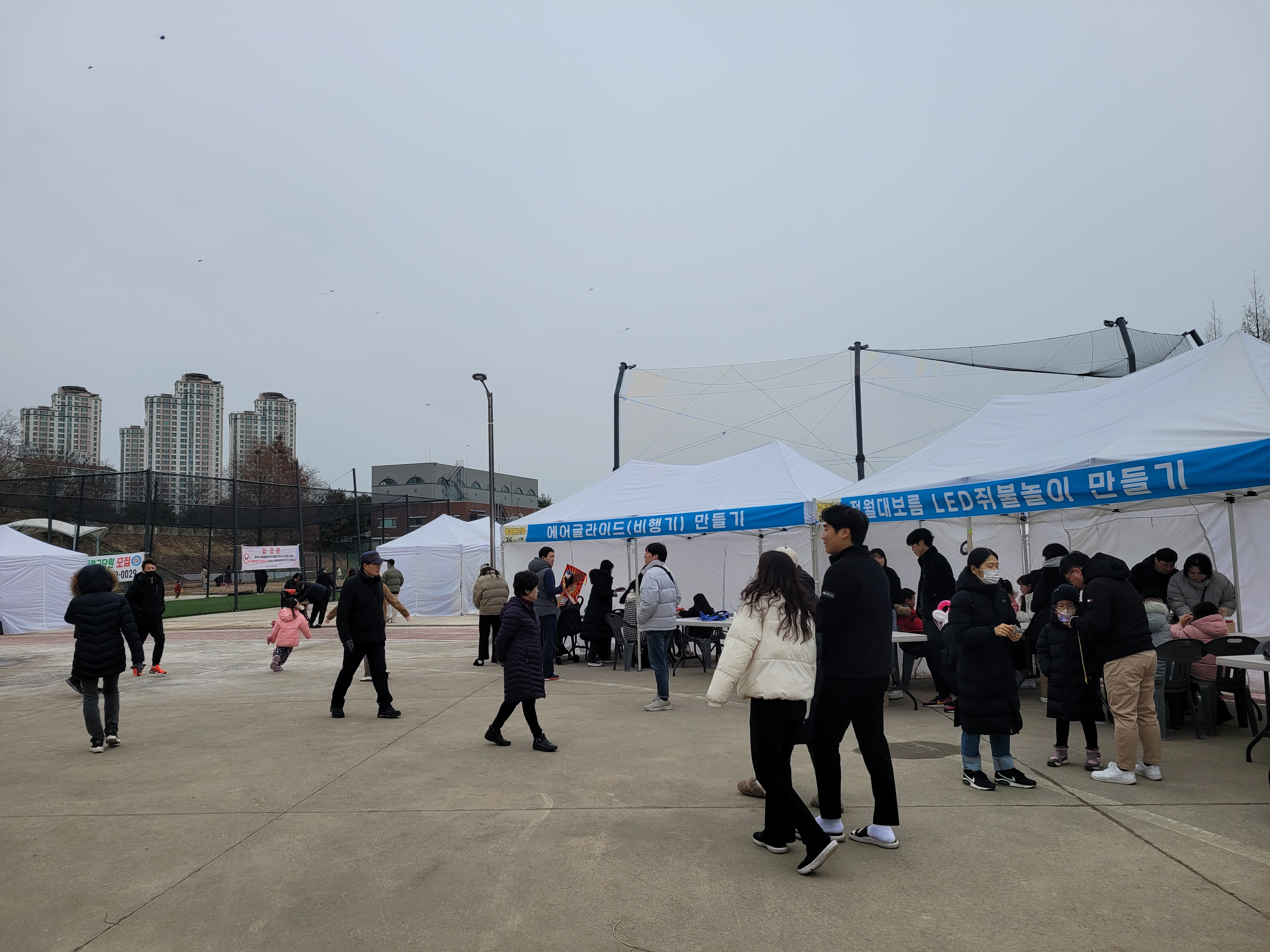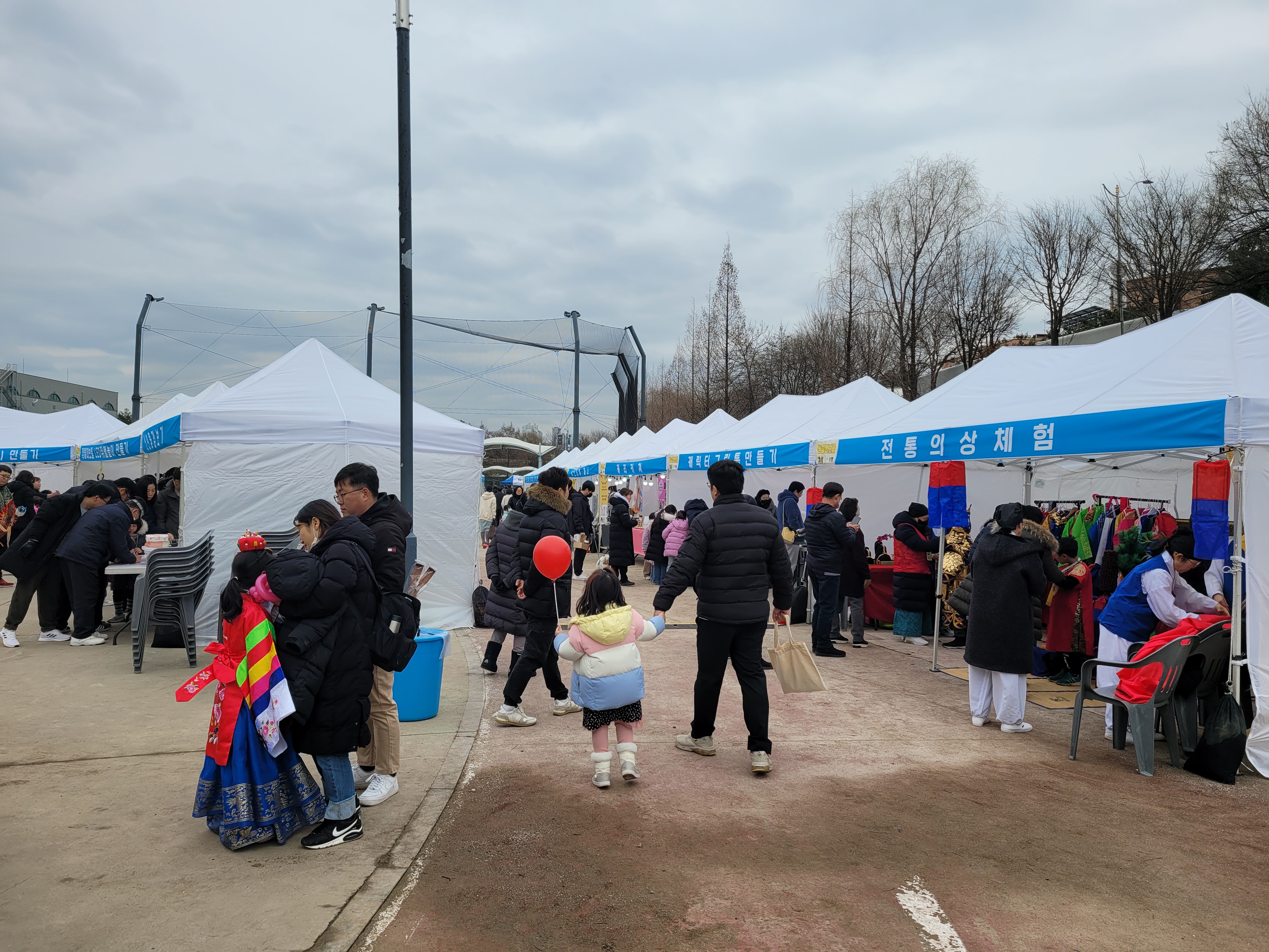 많은 사람들이 연날리기도 하고 제기차기도 하고 각종 체험행사도 하고 먹거리도 먹는