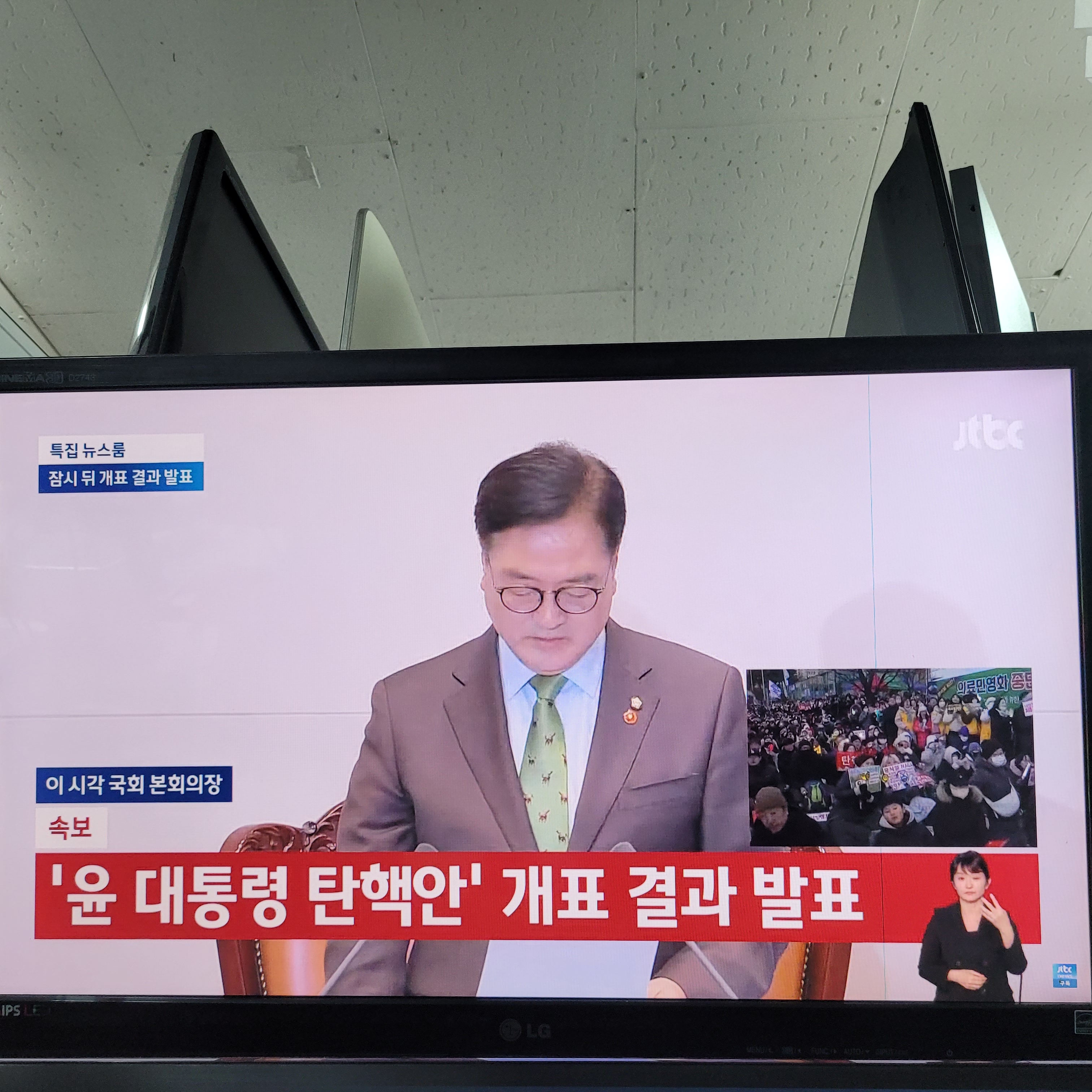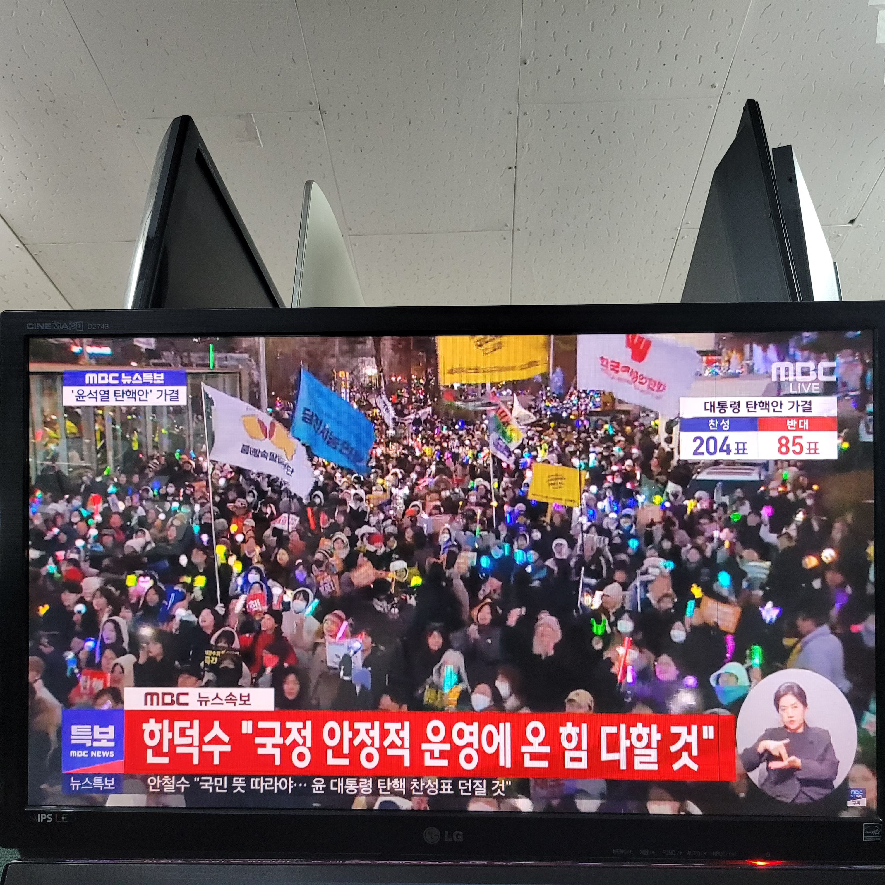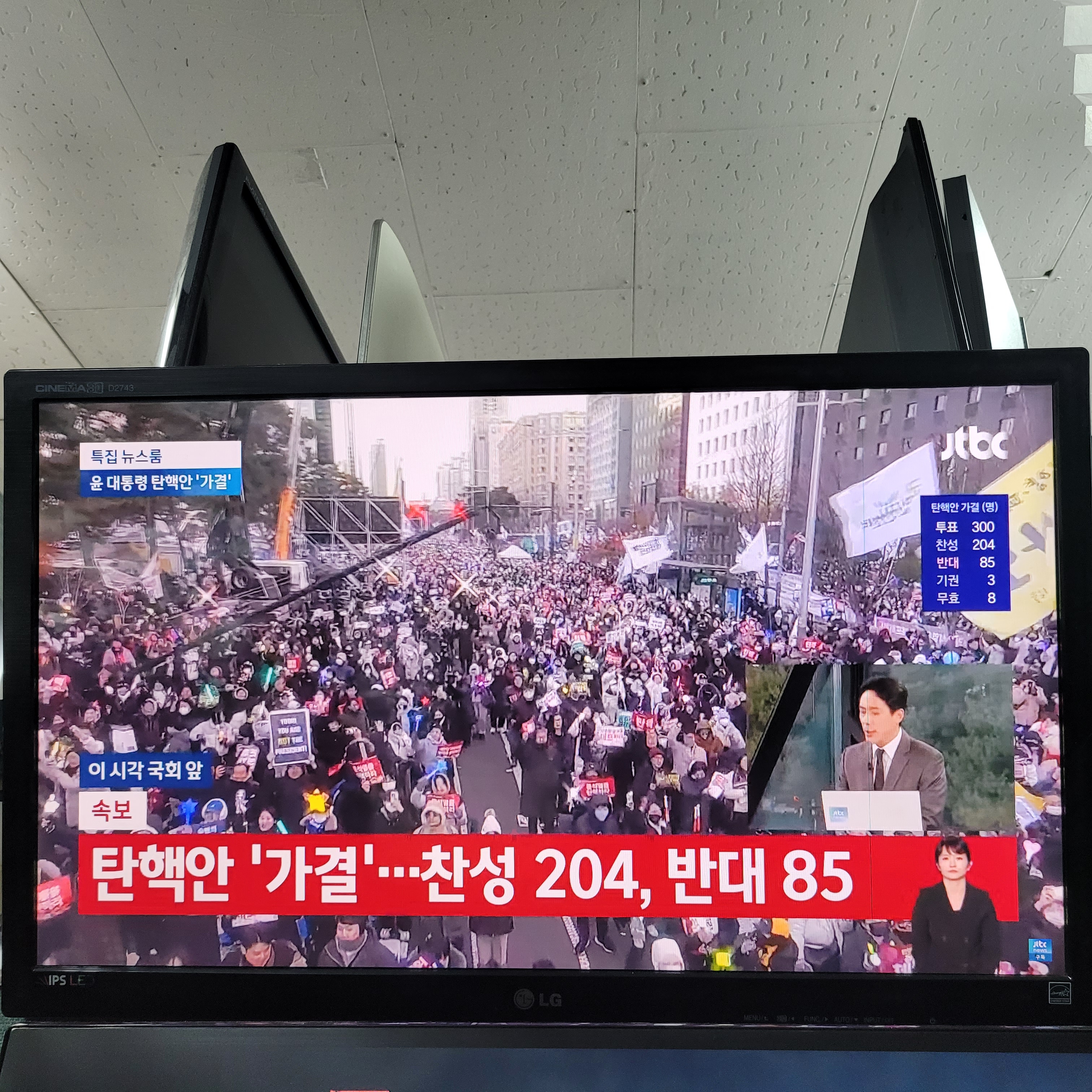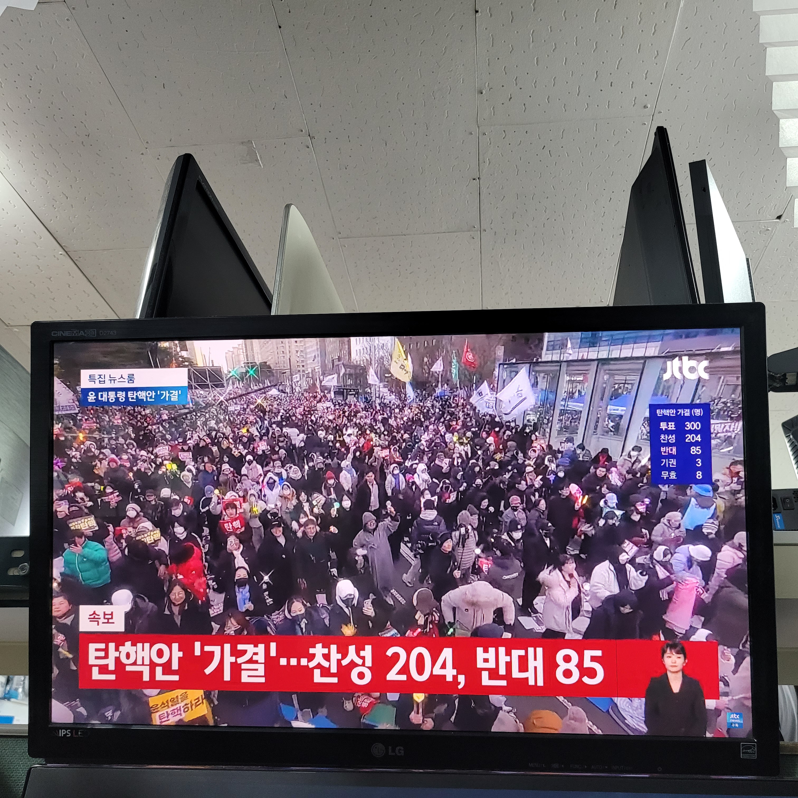 수리점 찾아와서 탄핵투표 결과를 확인했는데 찬성 204표, 반대 85표,