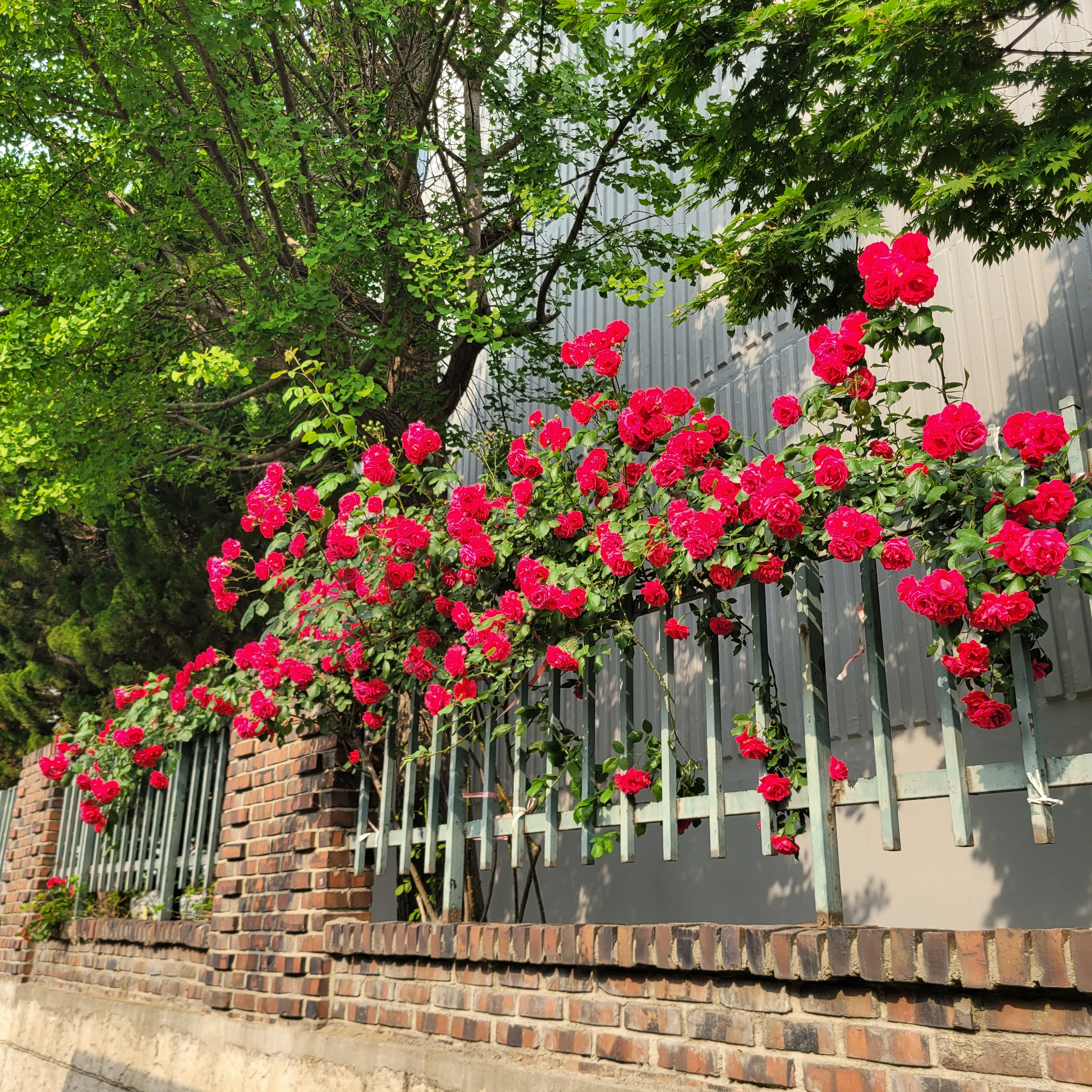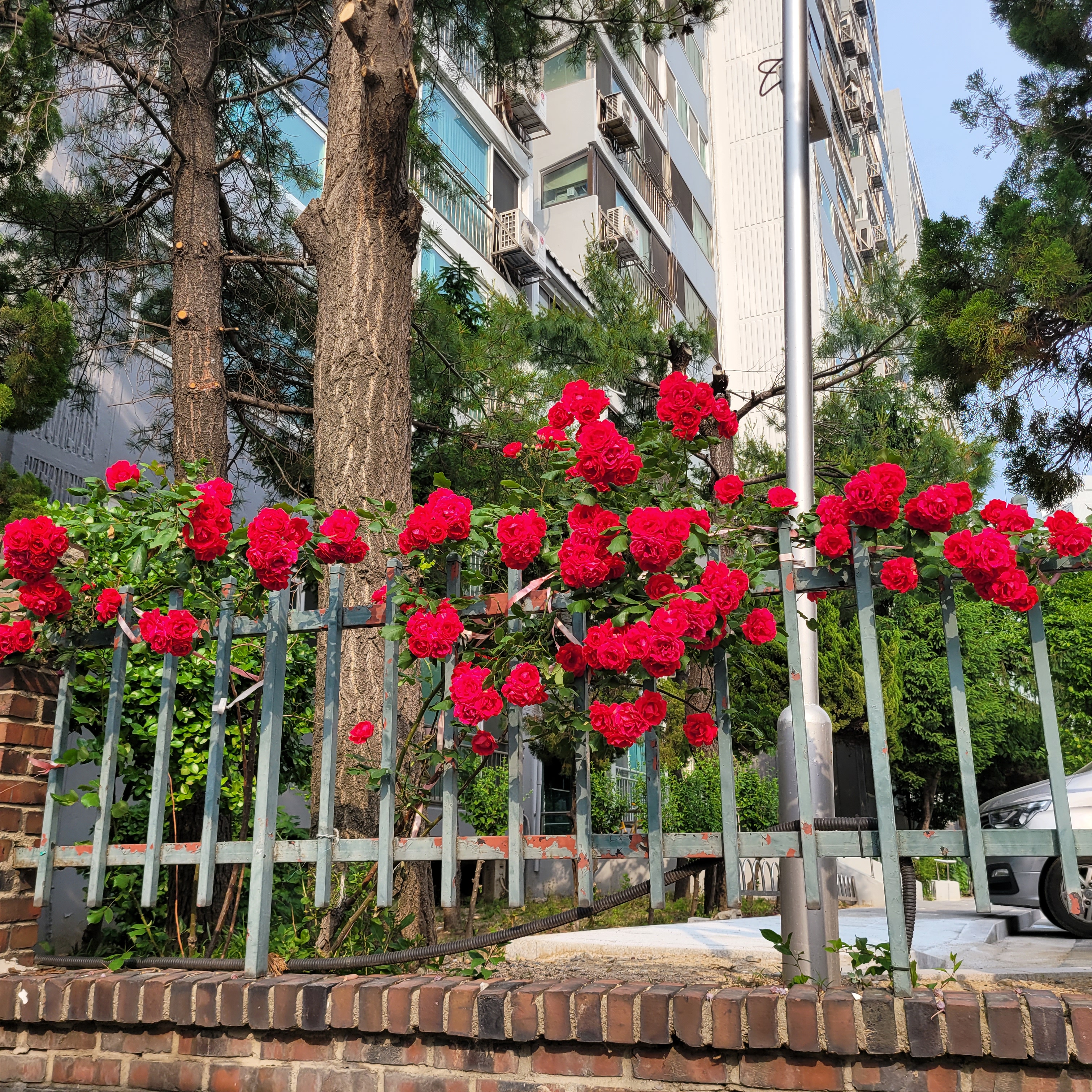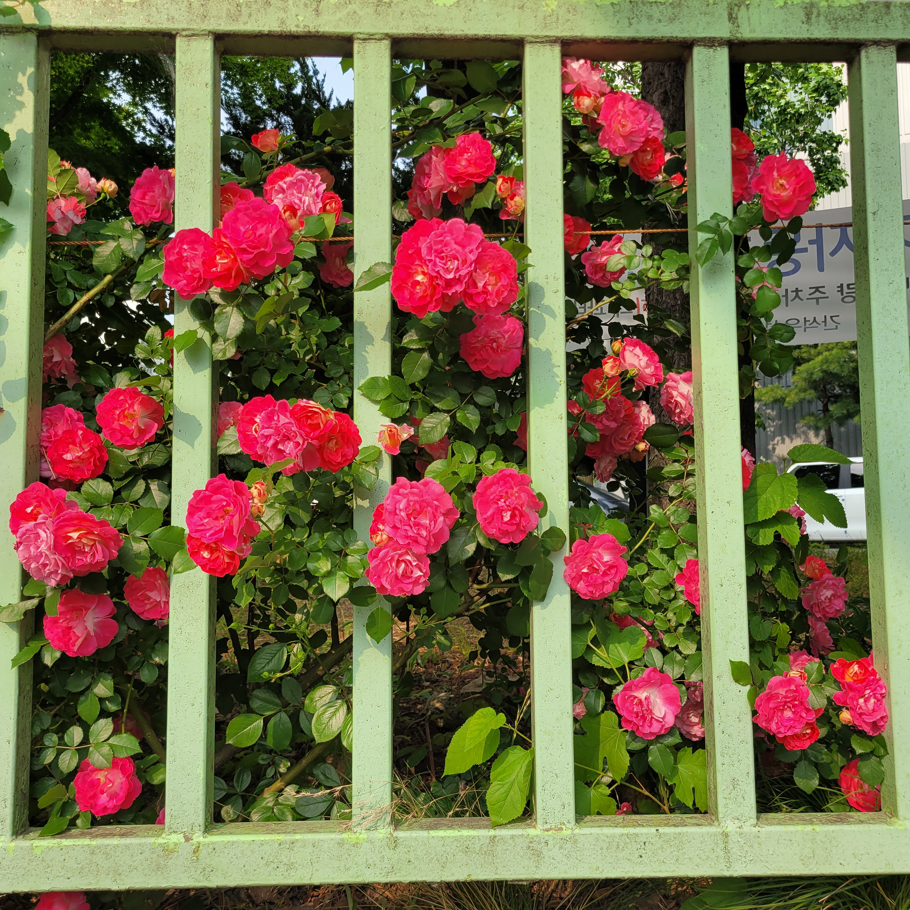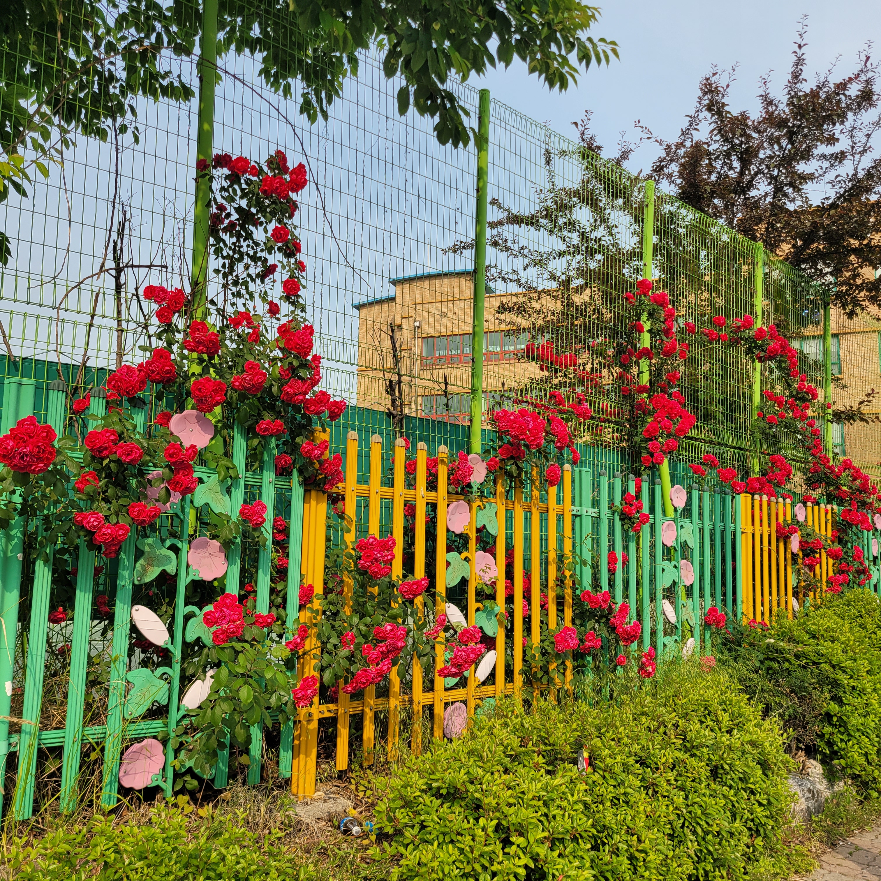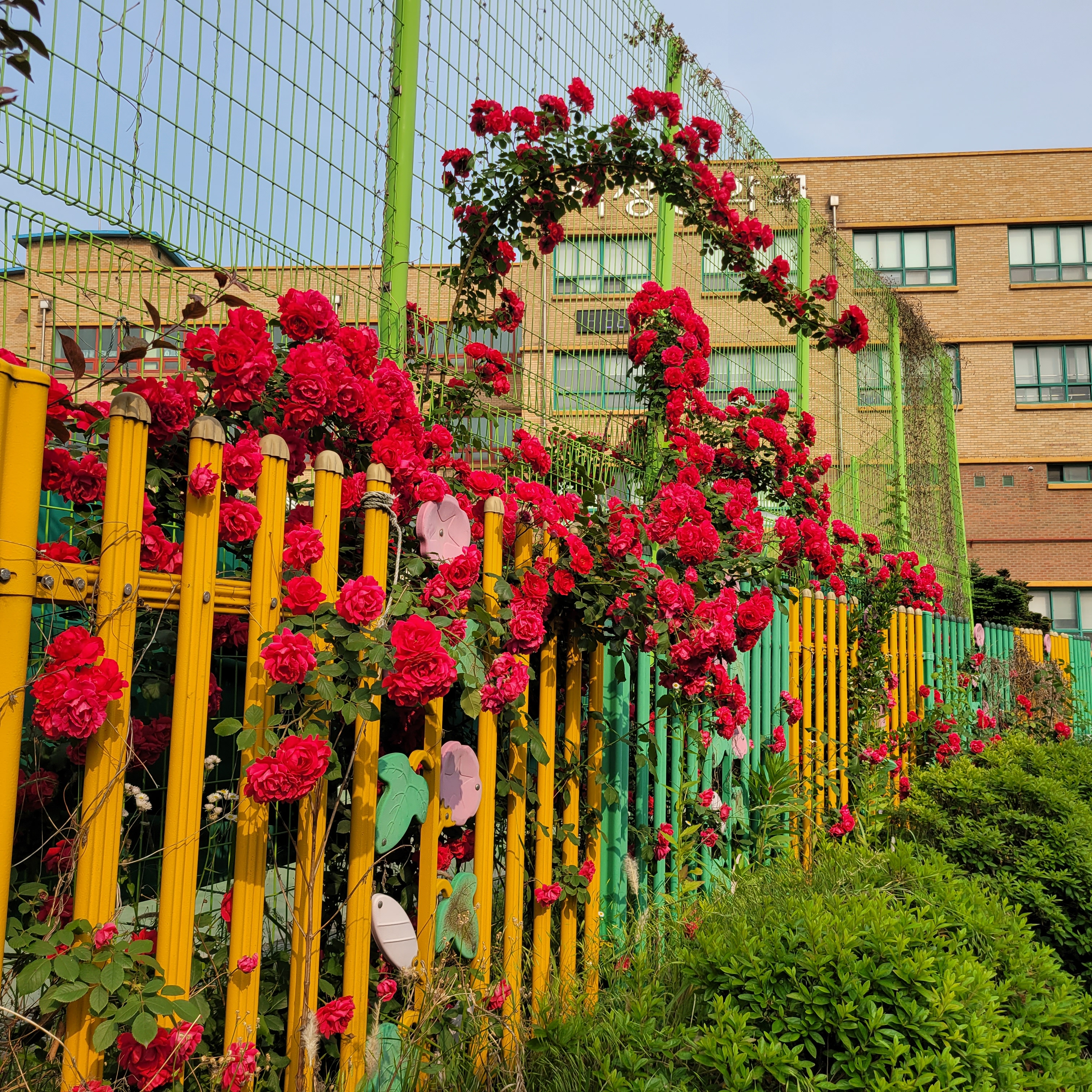 학교 담벼락 등지에 장미꽃이 아름답게 피었더라고요.