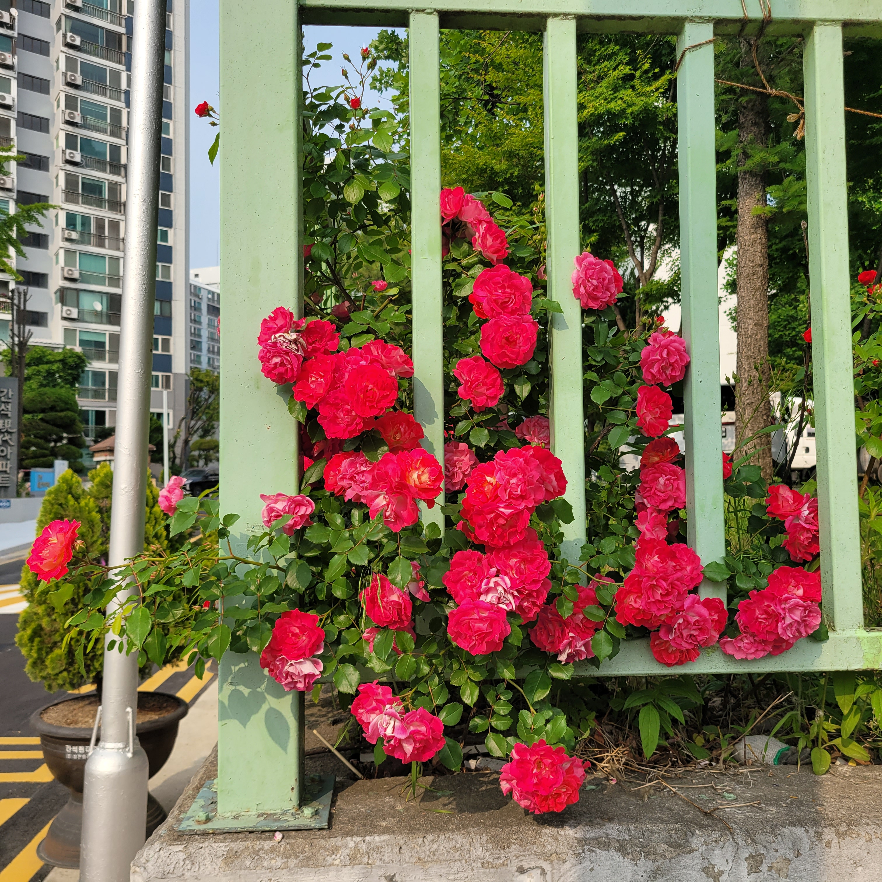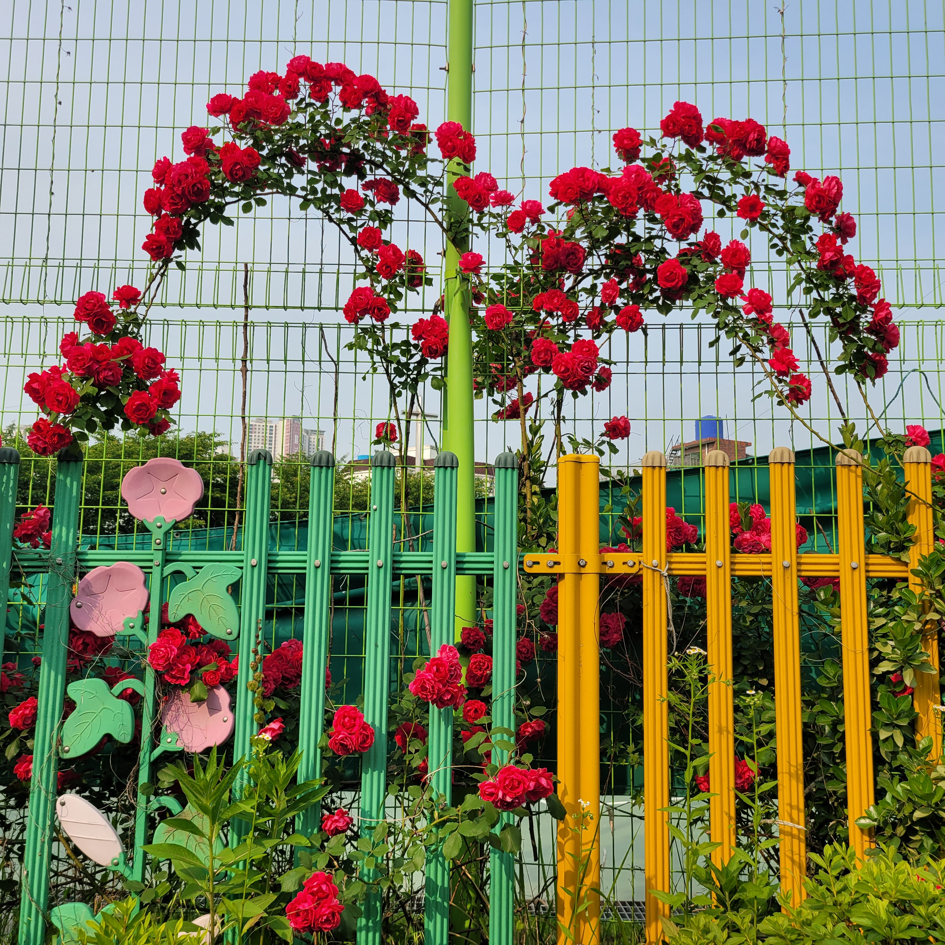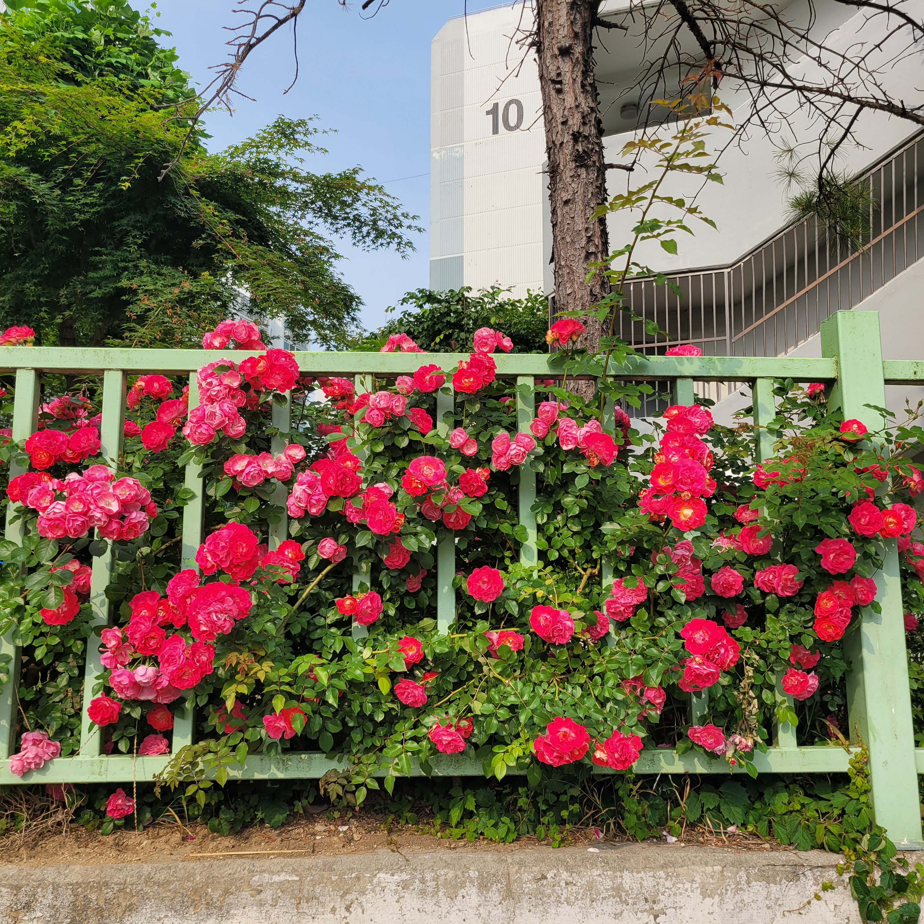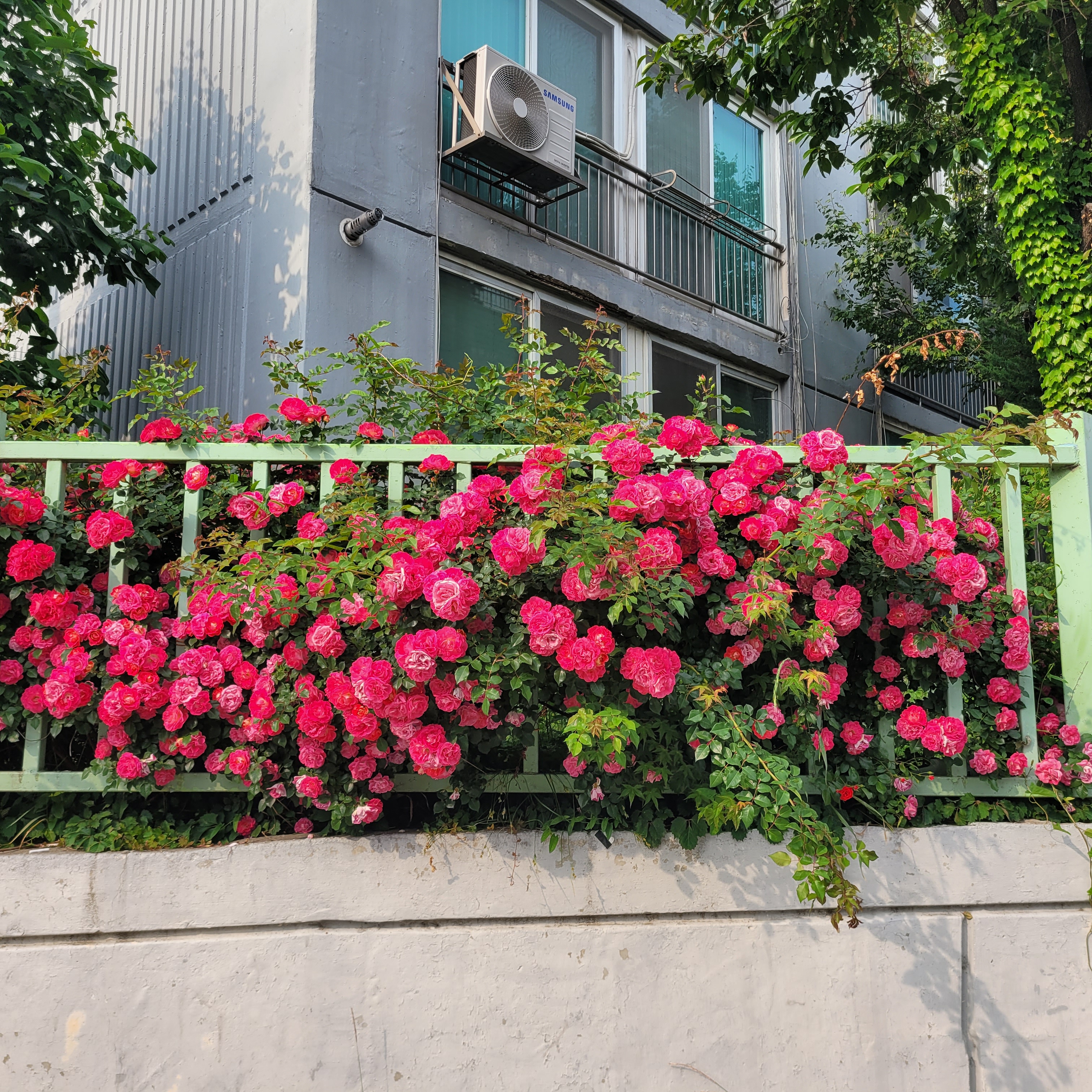 학교 담벼락 등지에 장미꽃이 아름답게 피었더라고요.