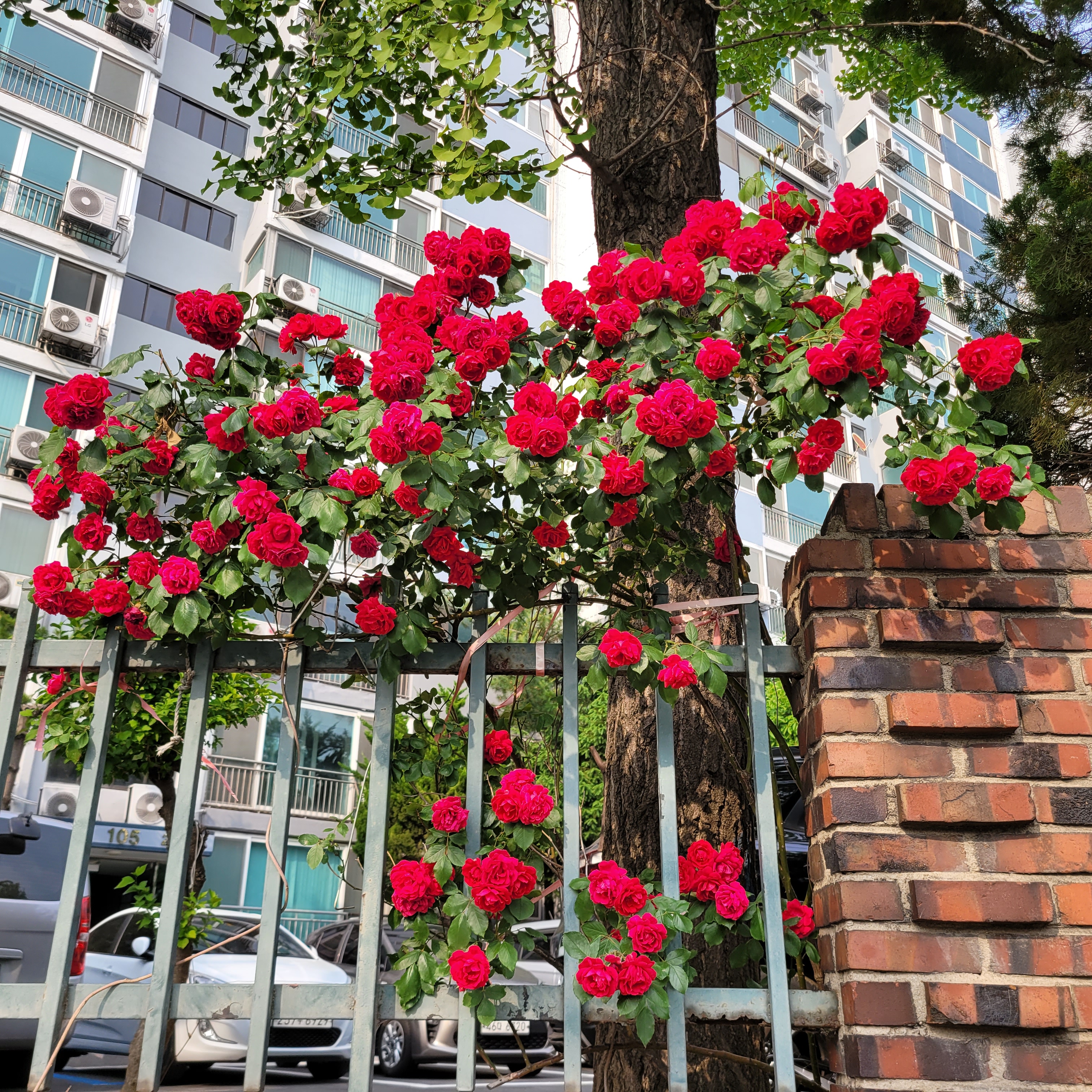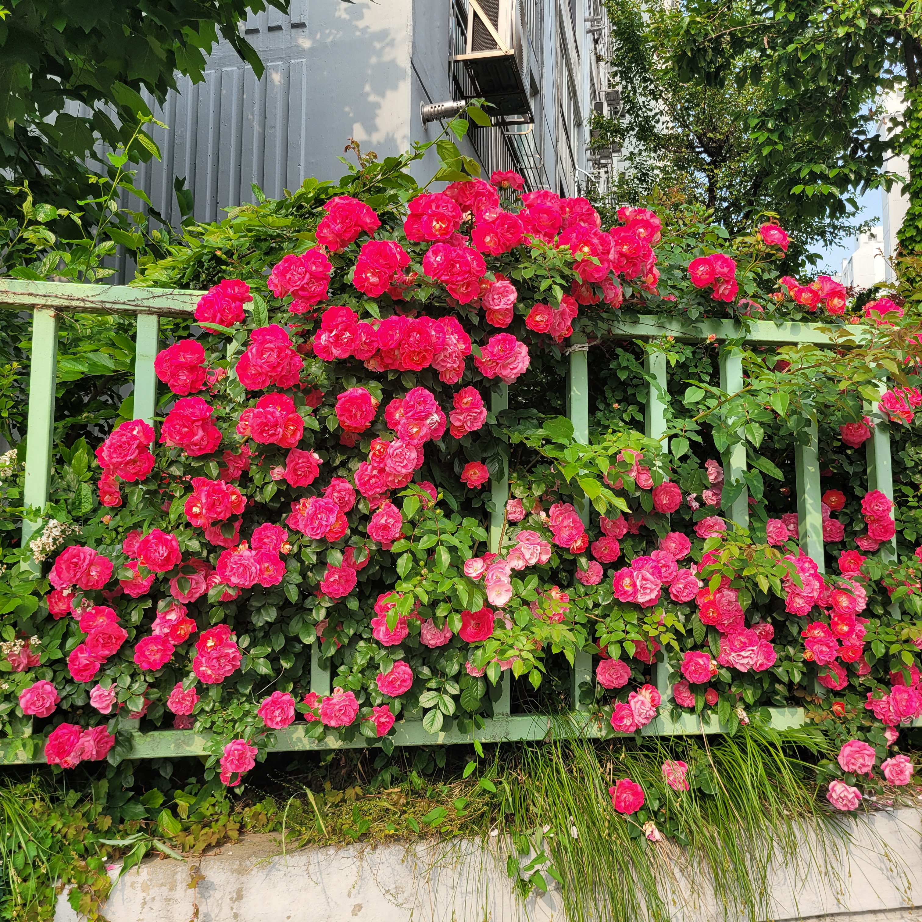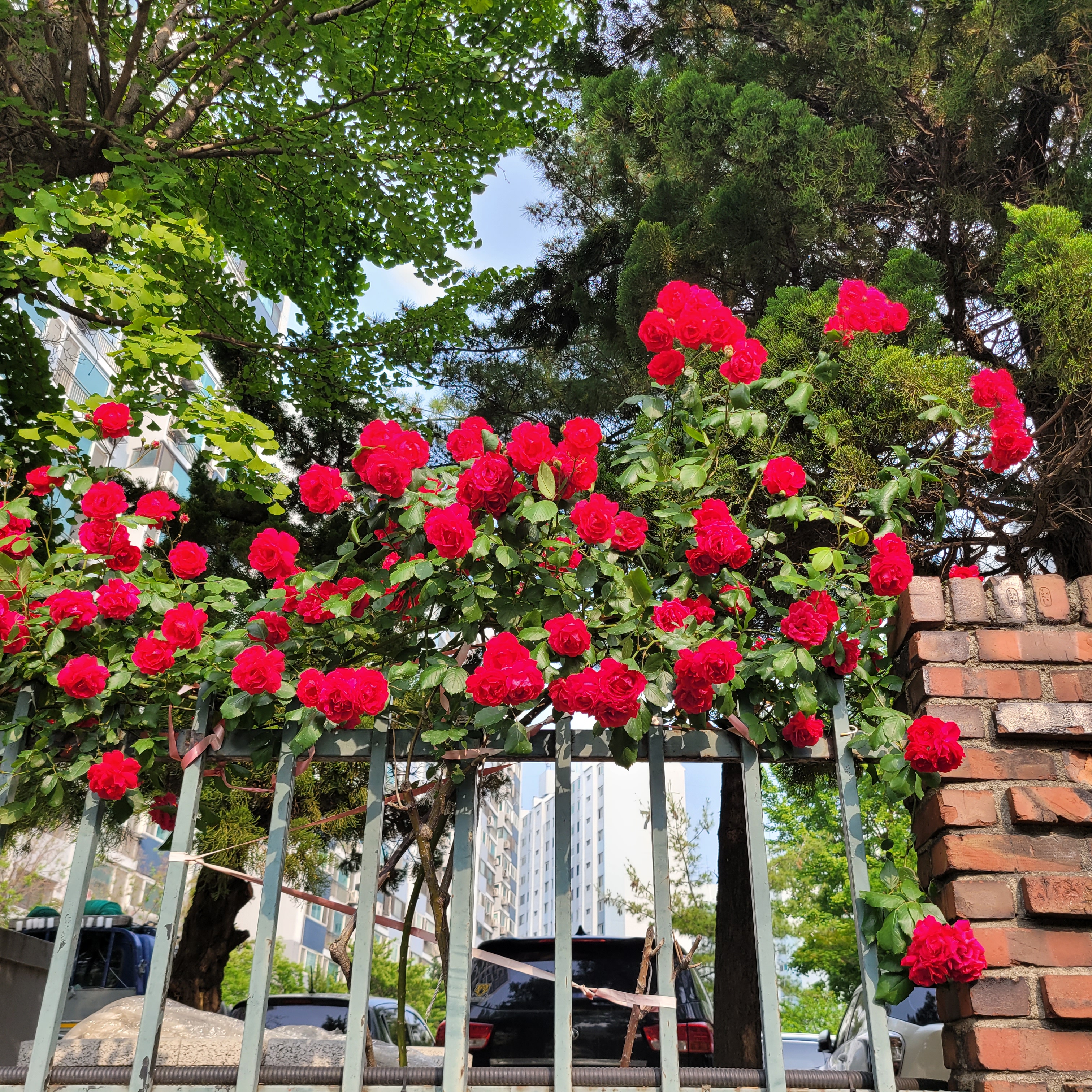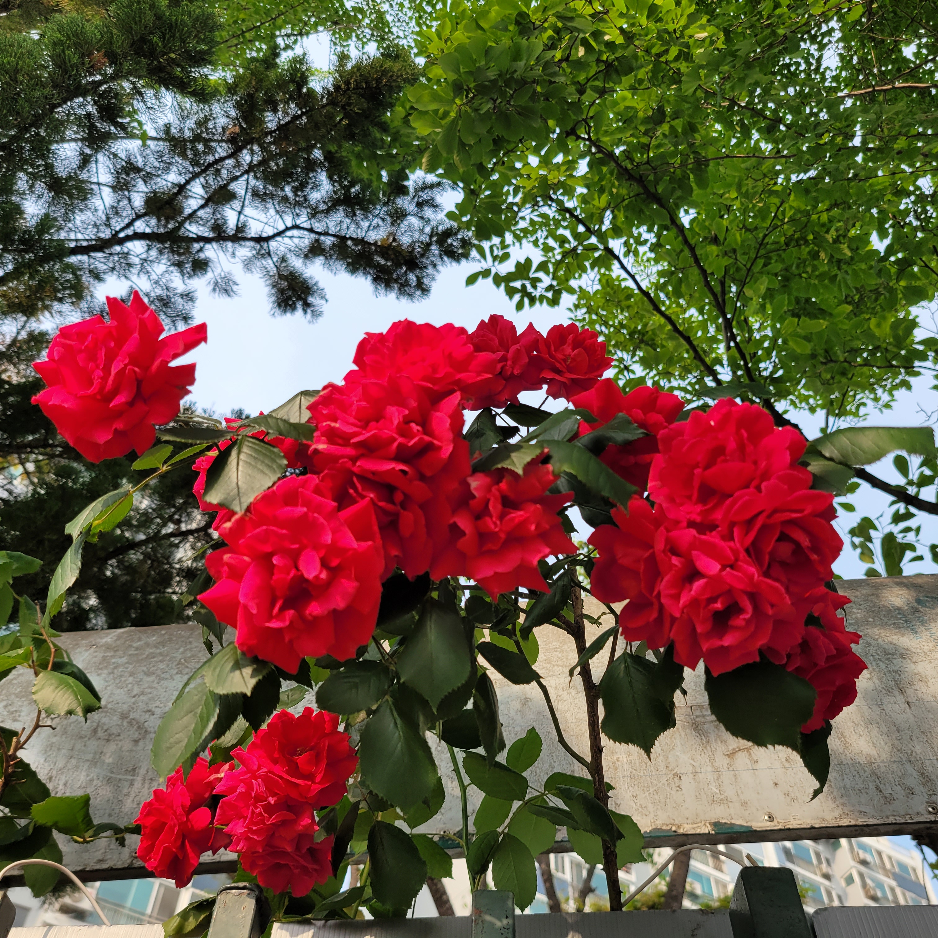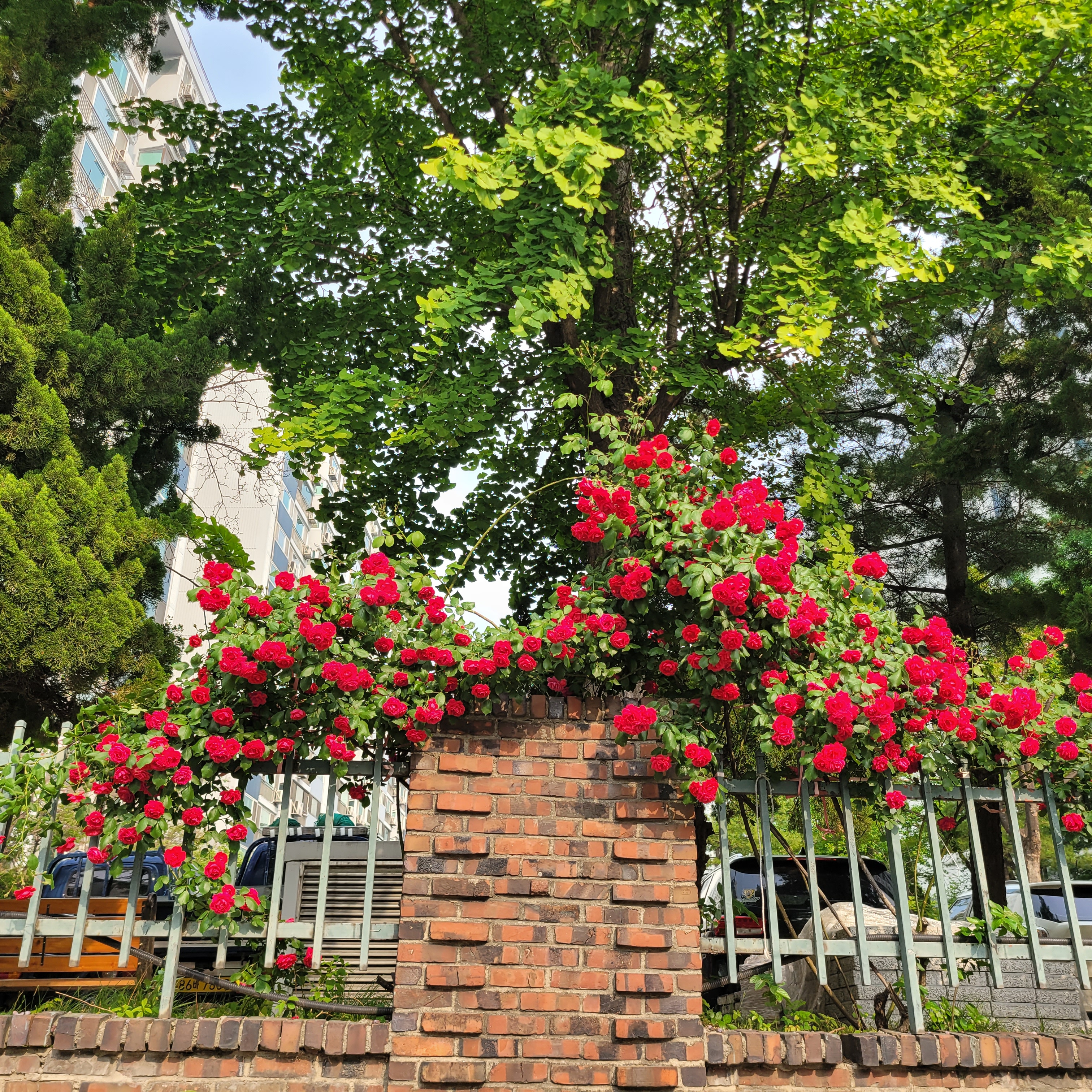 학교 담벼락 등지에 장미꽃이 아름답게 피었더라고요.