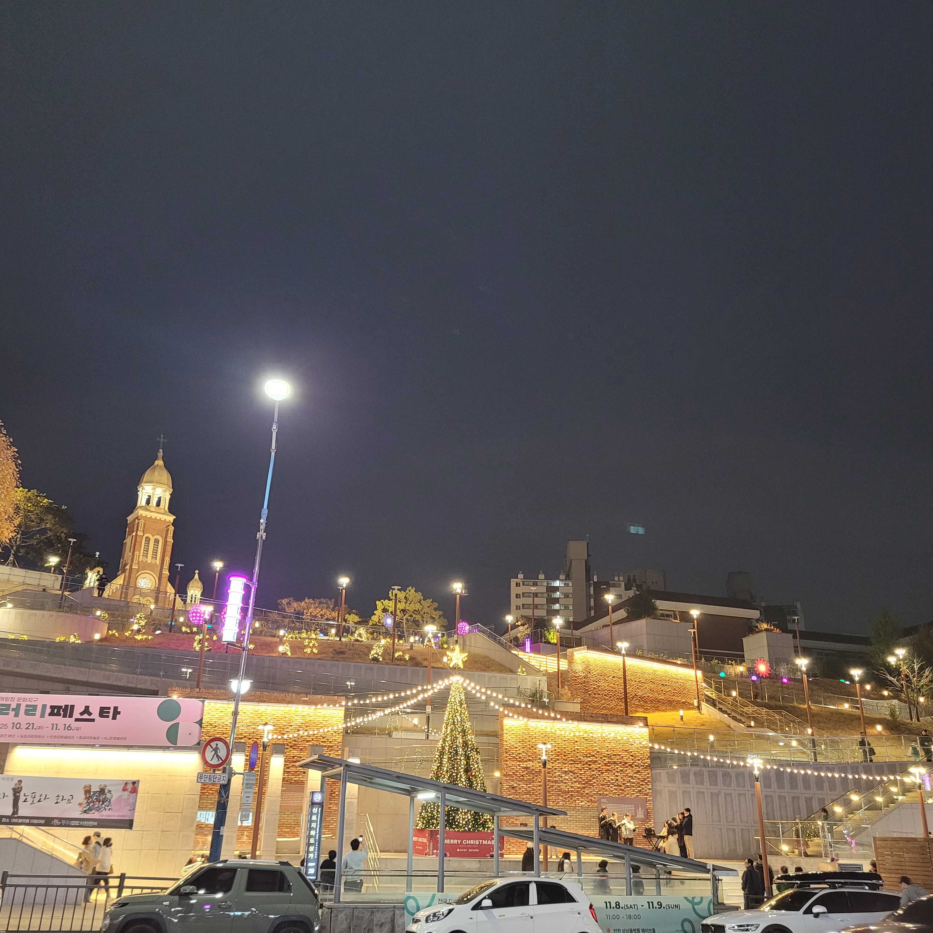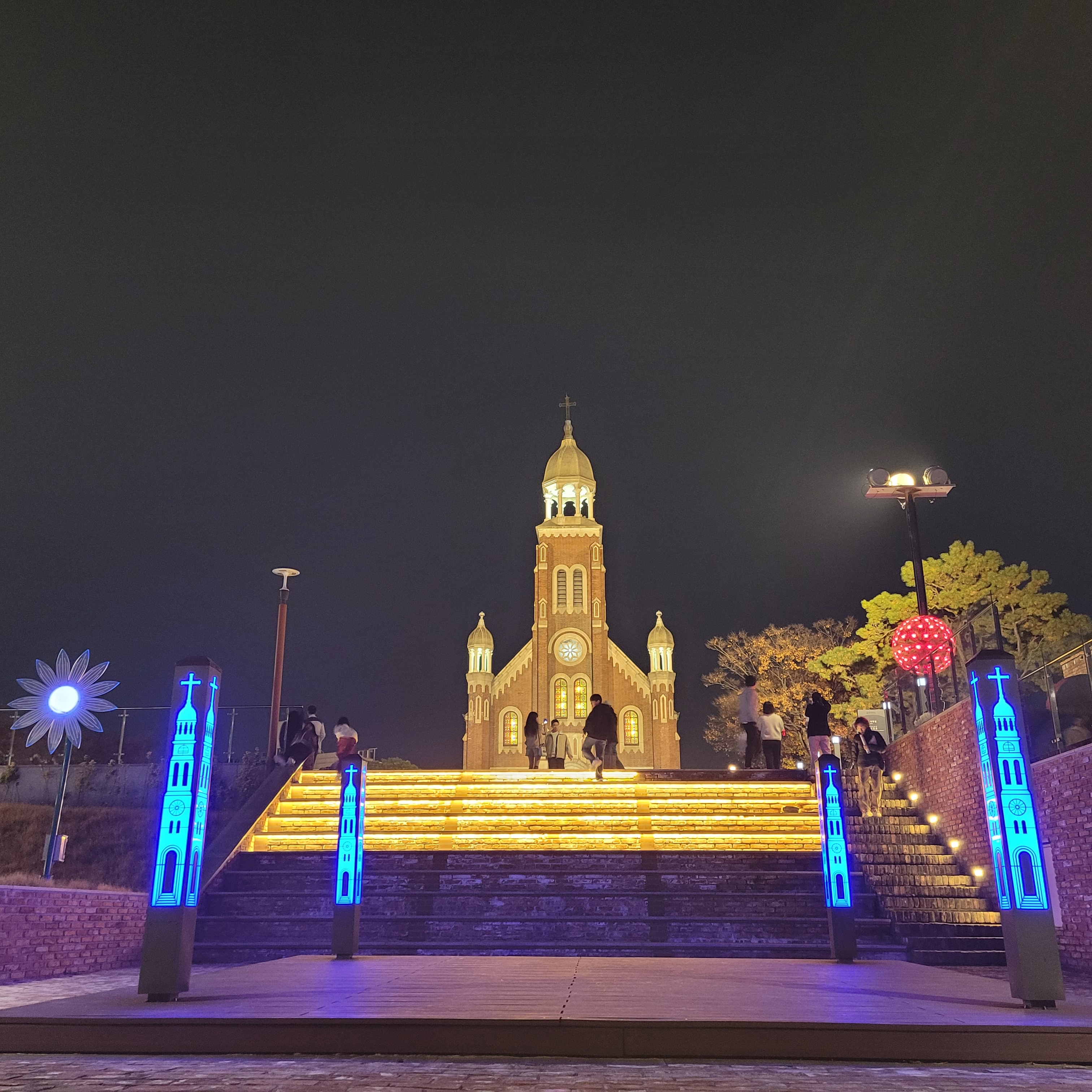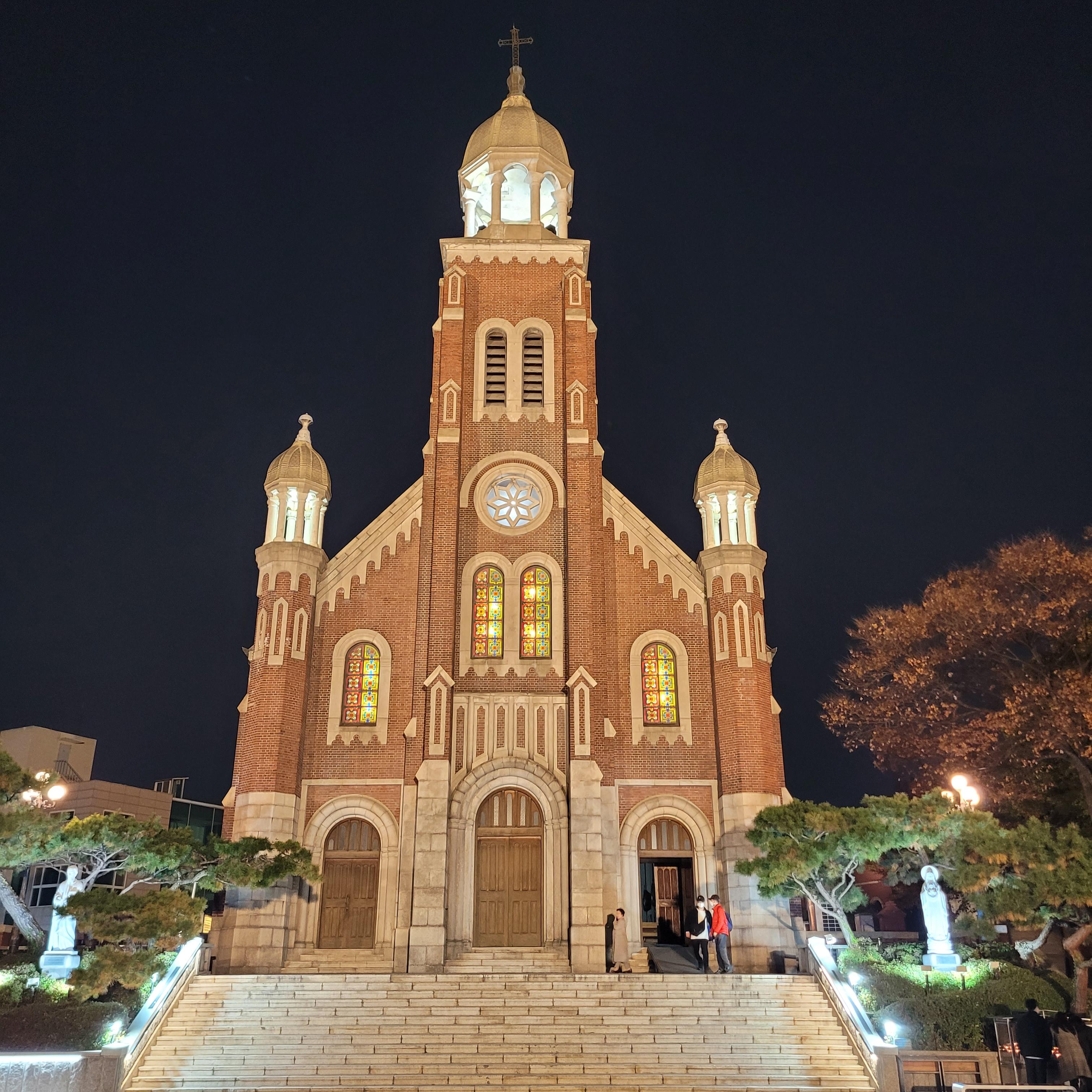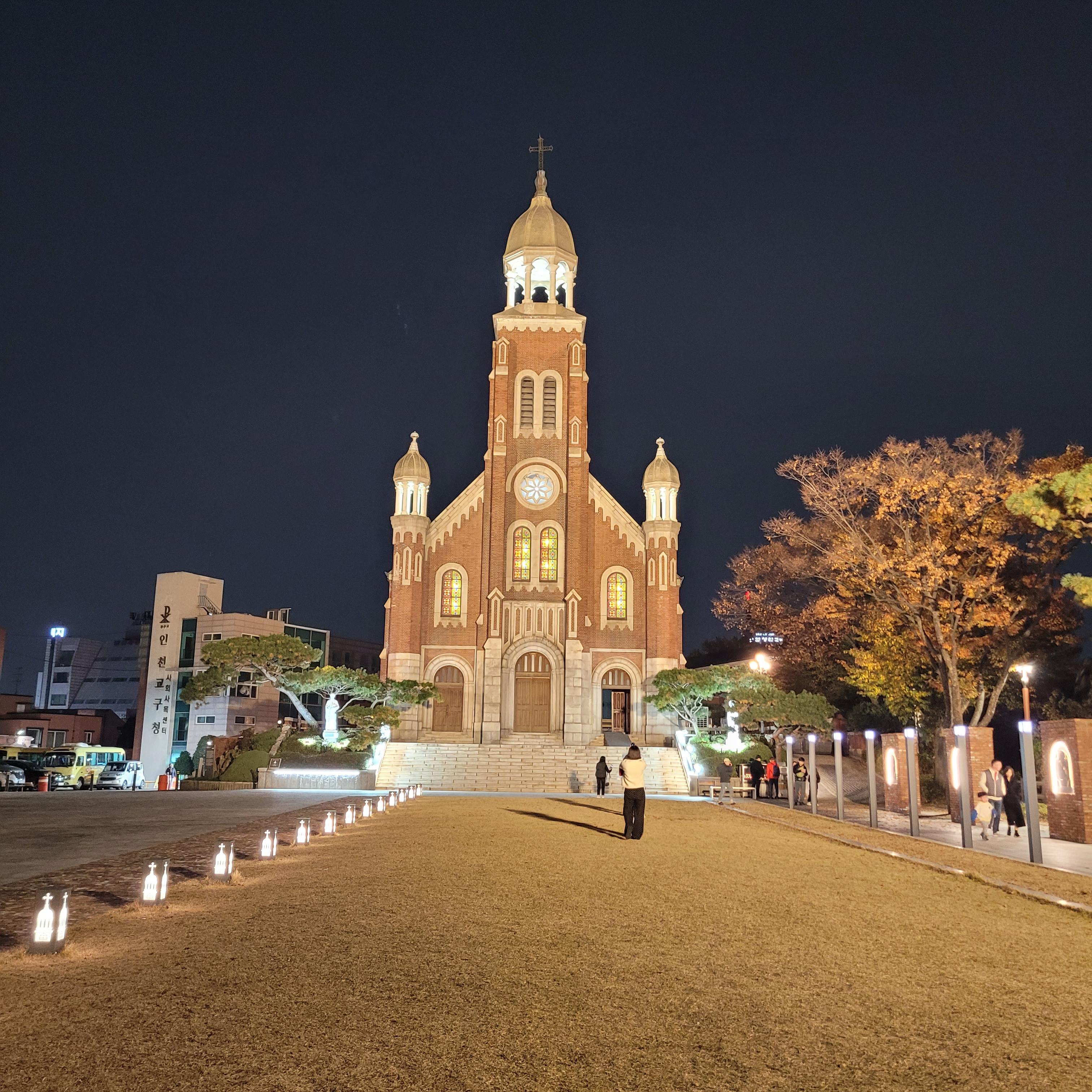 트리 뒤로 계단을 올라가보니 답동성당의 야경이 드러났는데