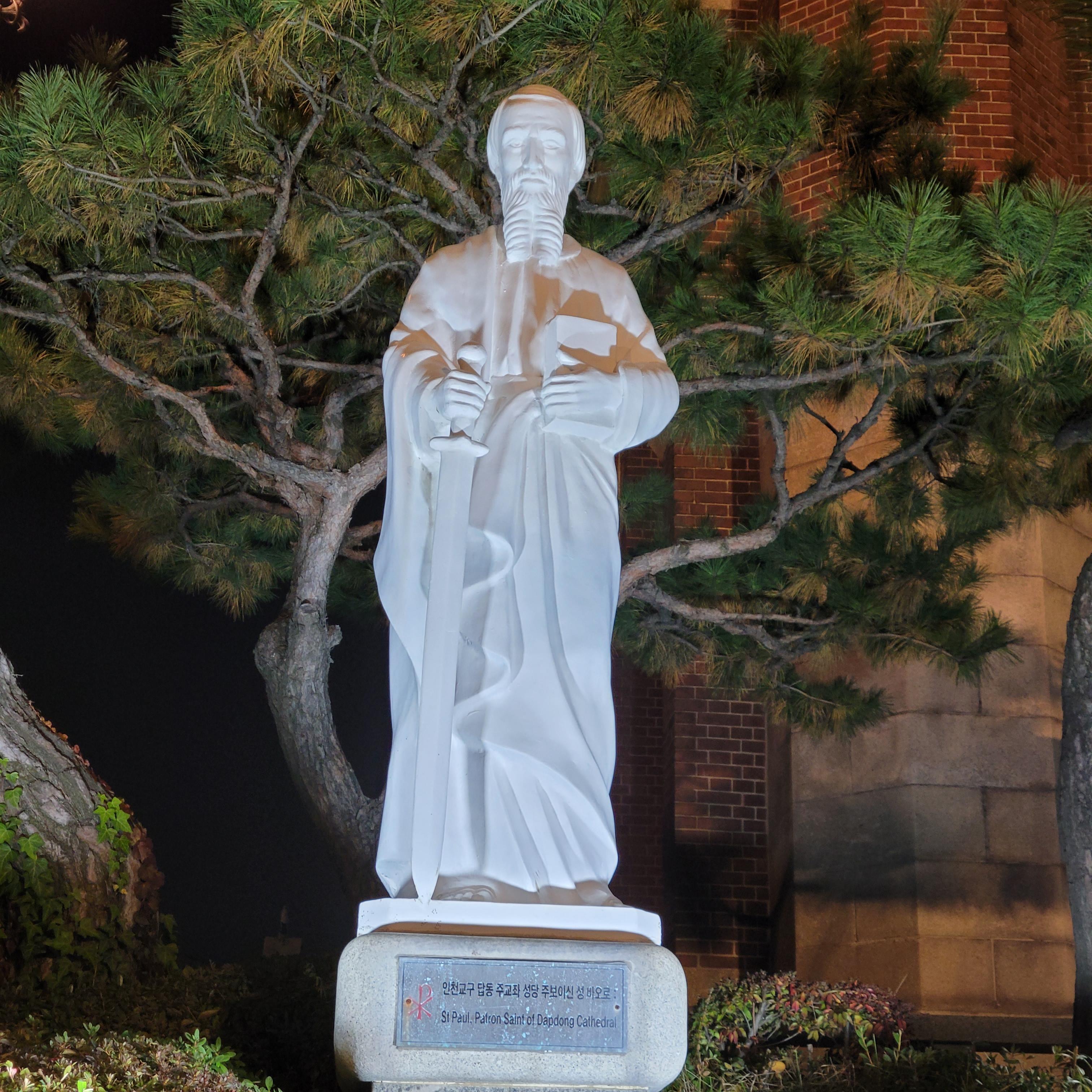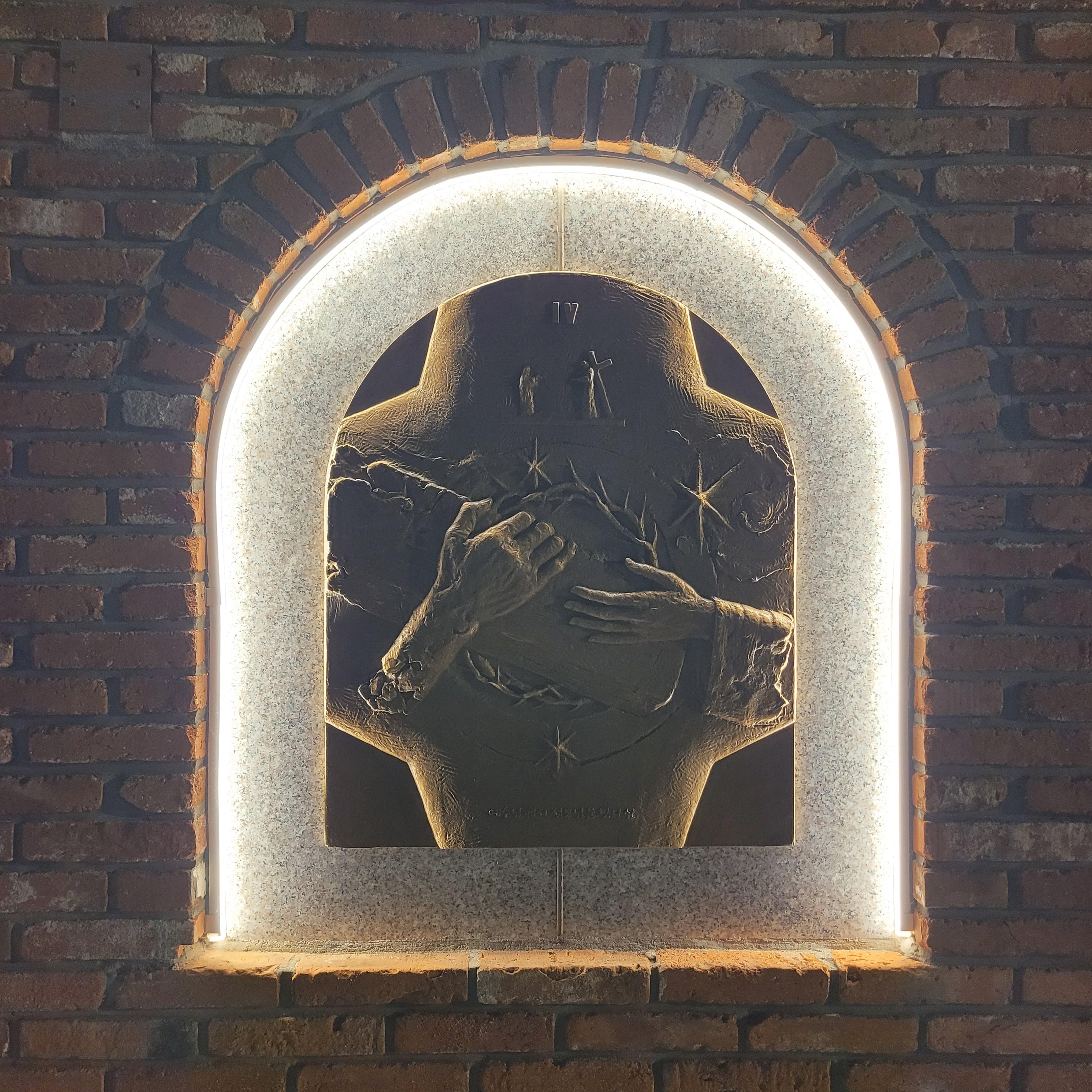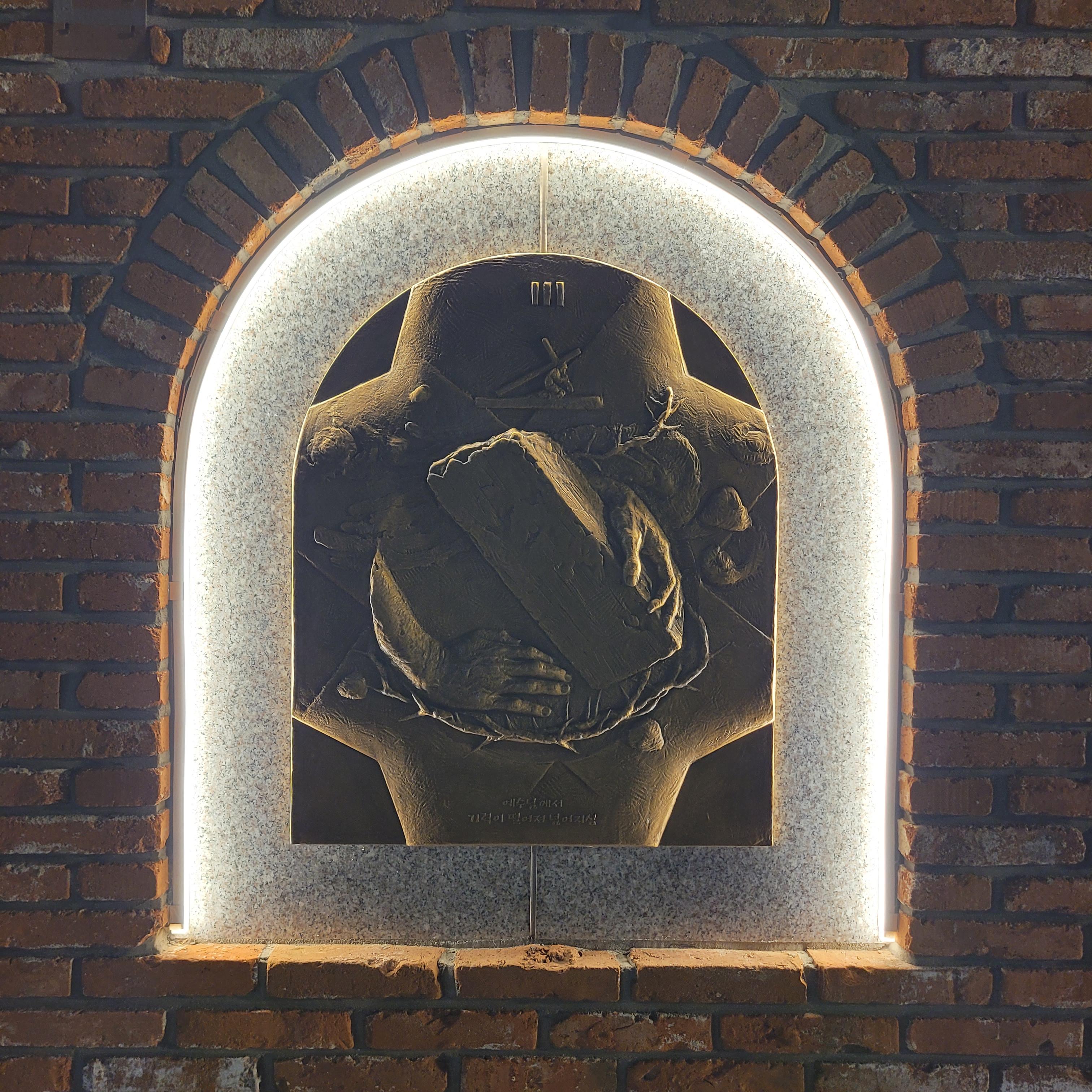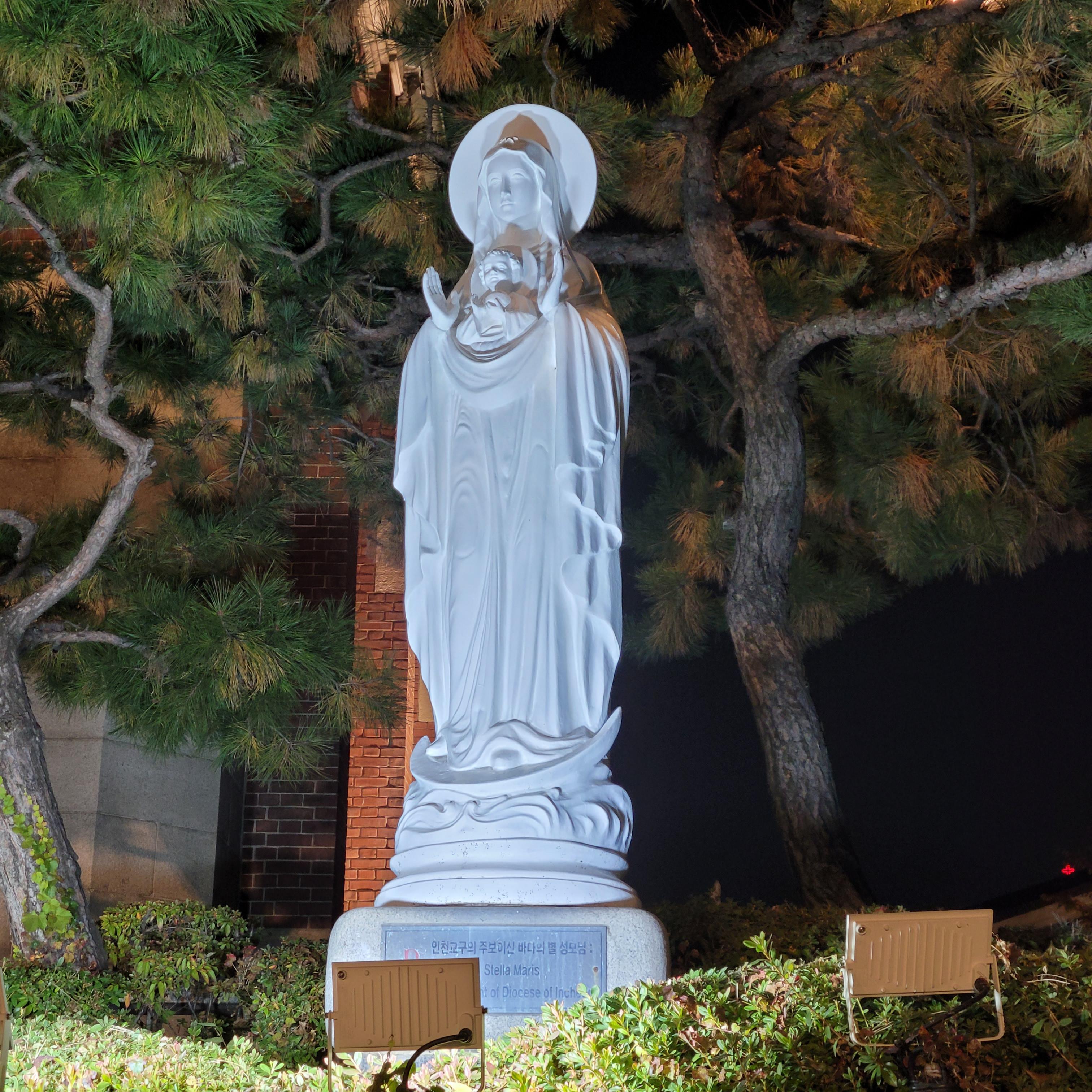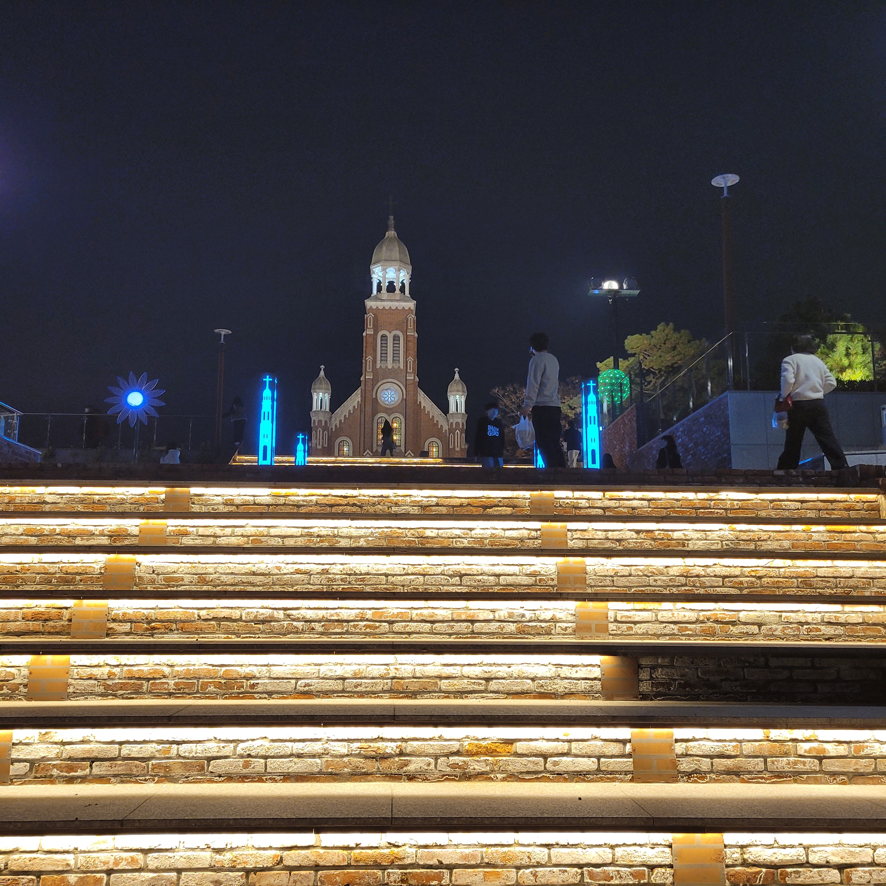 트리 뒤로 계단을 올라가보니 답동성당의 야경이 드러났는데