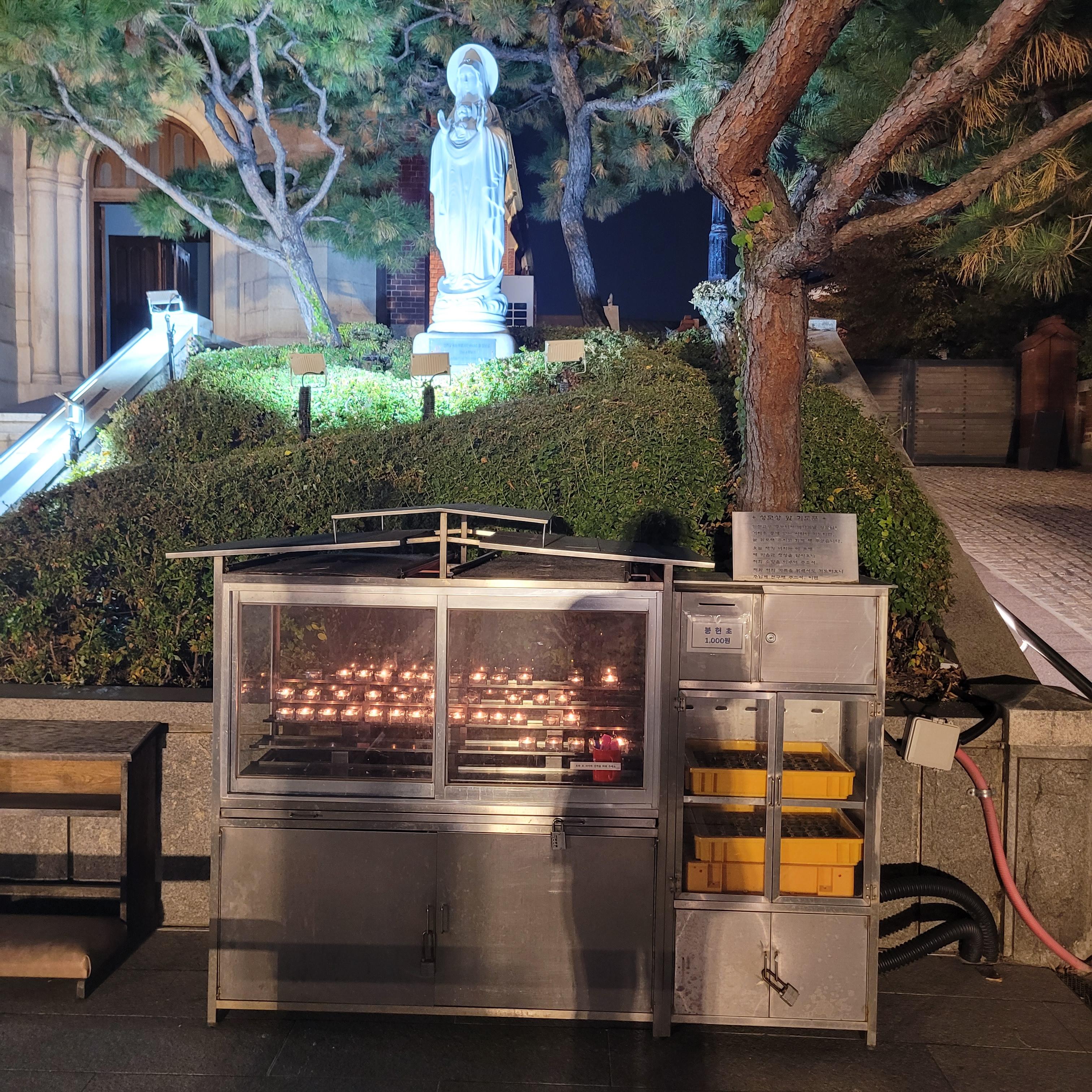 밤에 보는 성당 풍경이 아주 아름다웠네요. 많은 사람들이