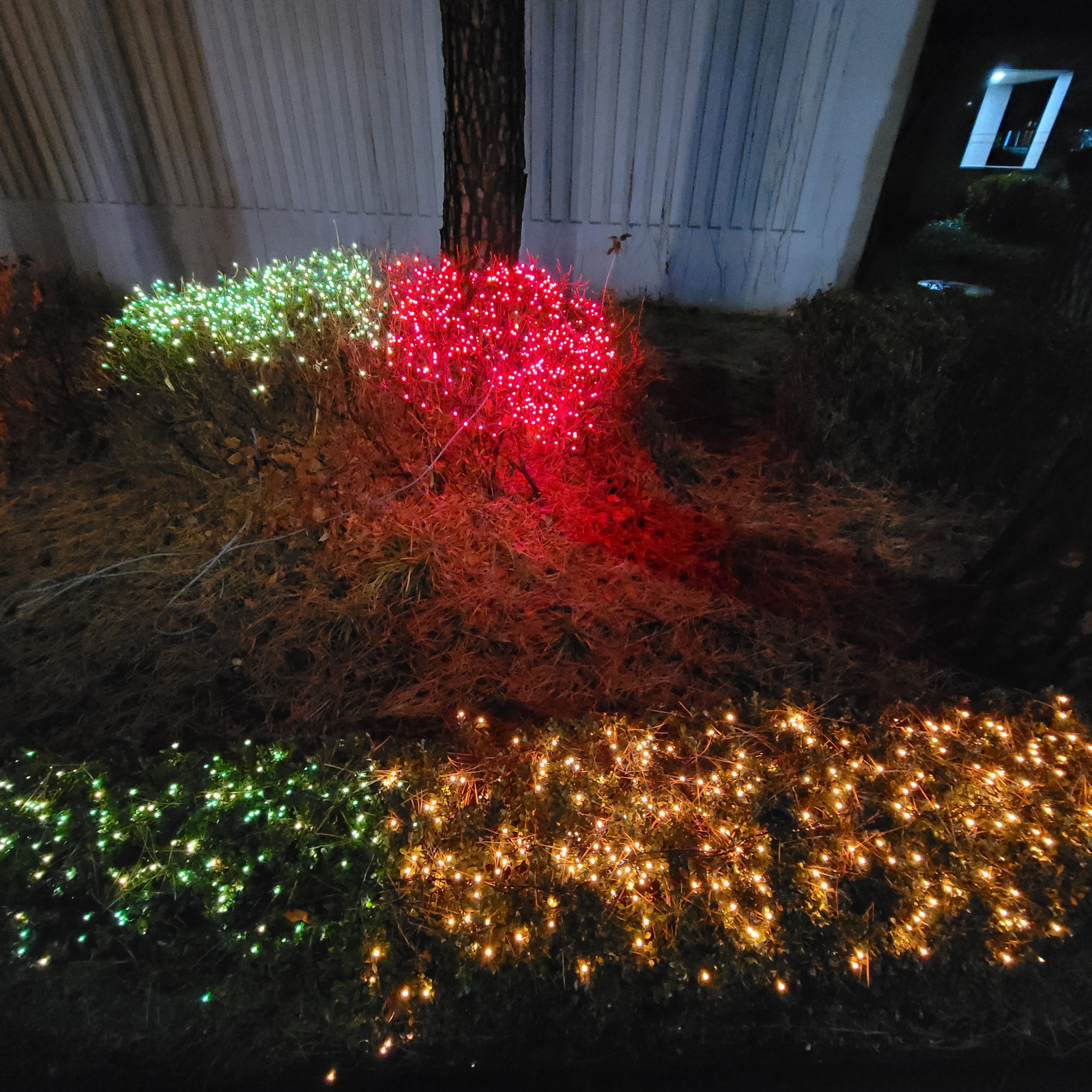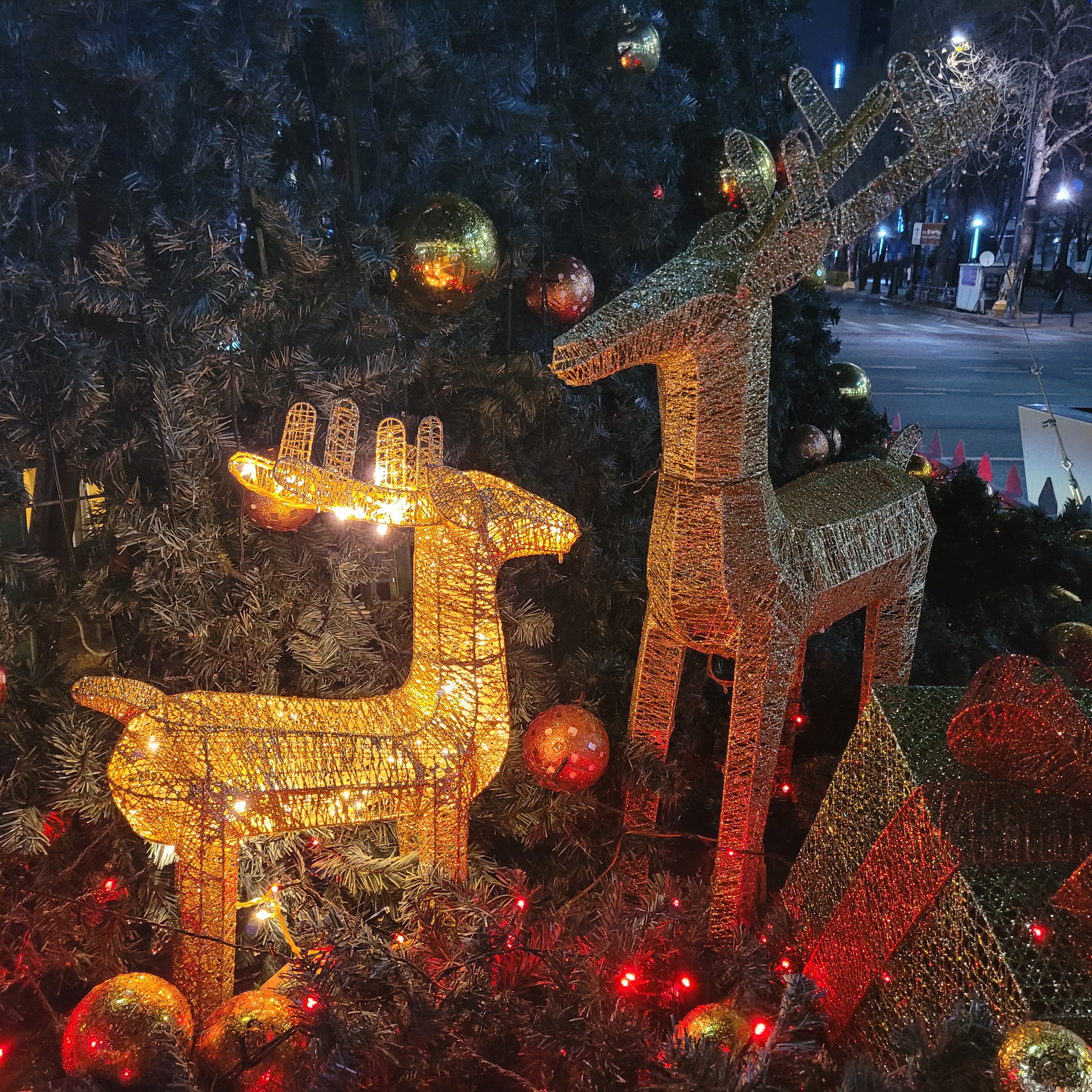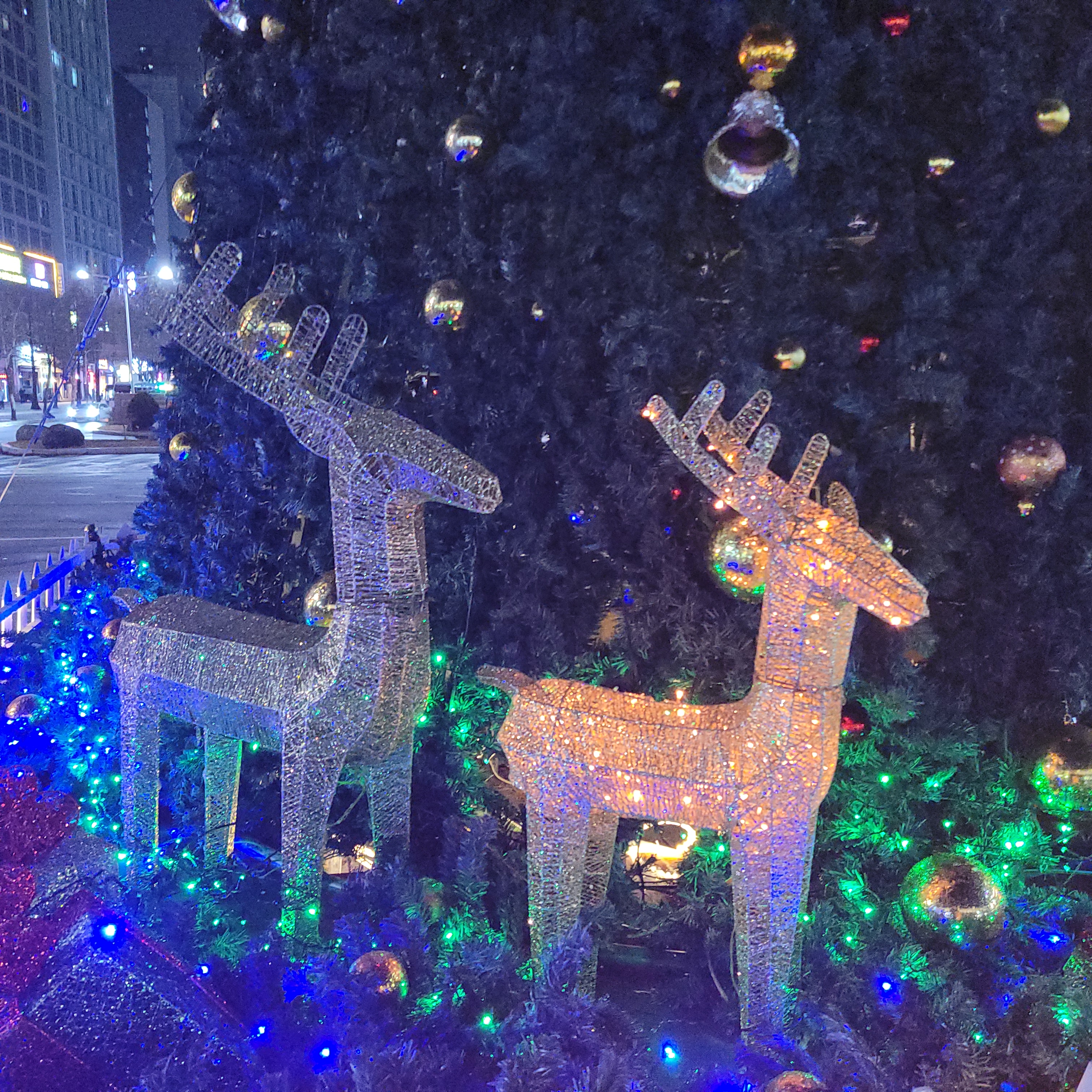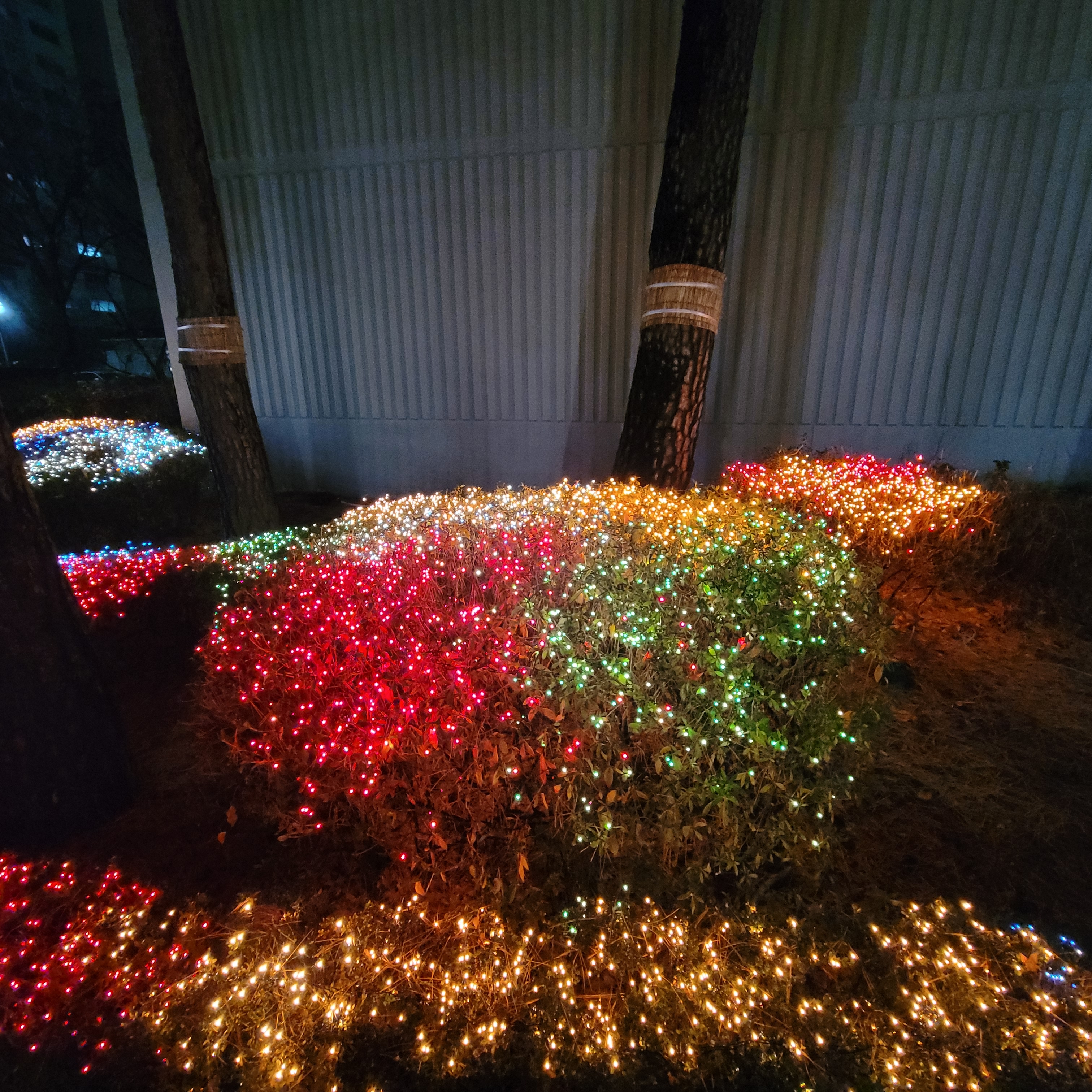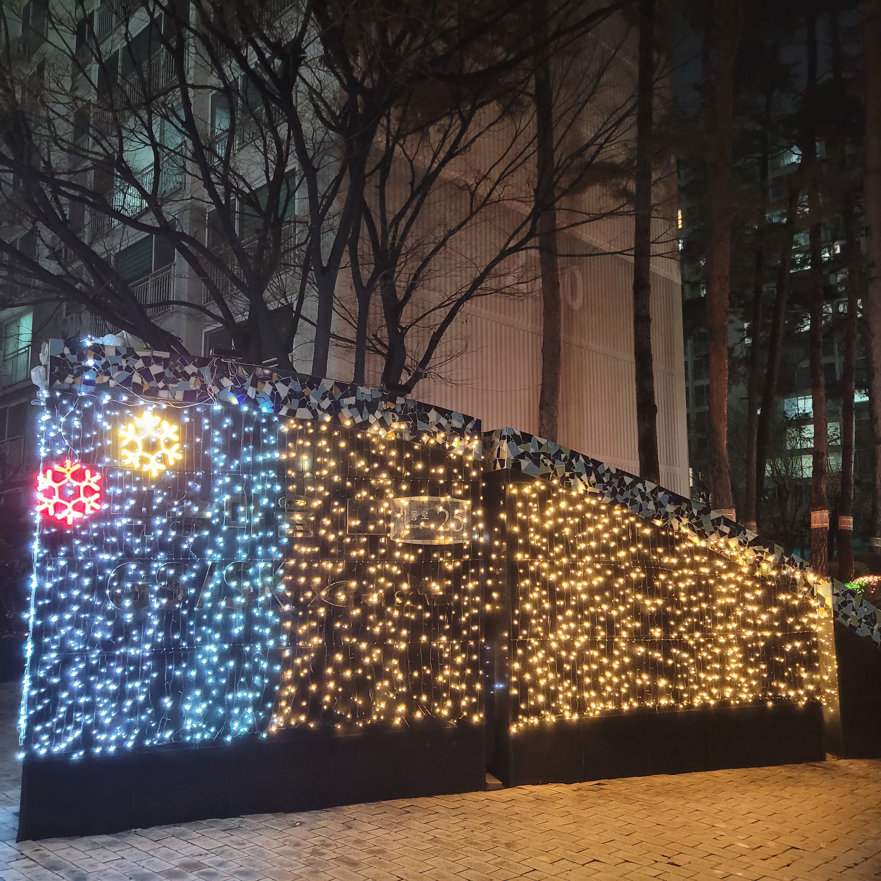 설치된 크리스마스 트리와 본가 아파트 앞에 설치된 불빛 풍경