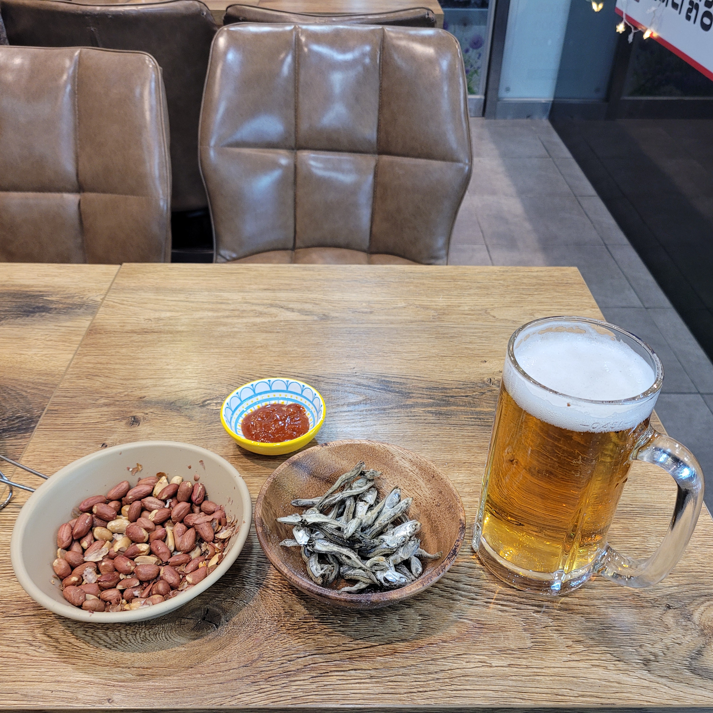 생맥주 한잔 먹었네요. 땅콩과 뻥튀기 마른 멸치는 서비스로 나왔고요. 소떡소떡은