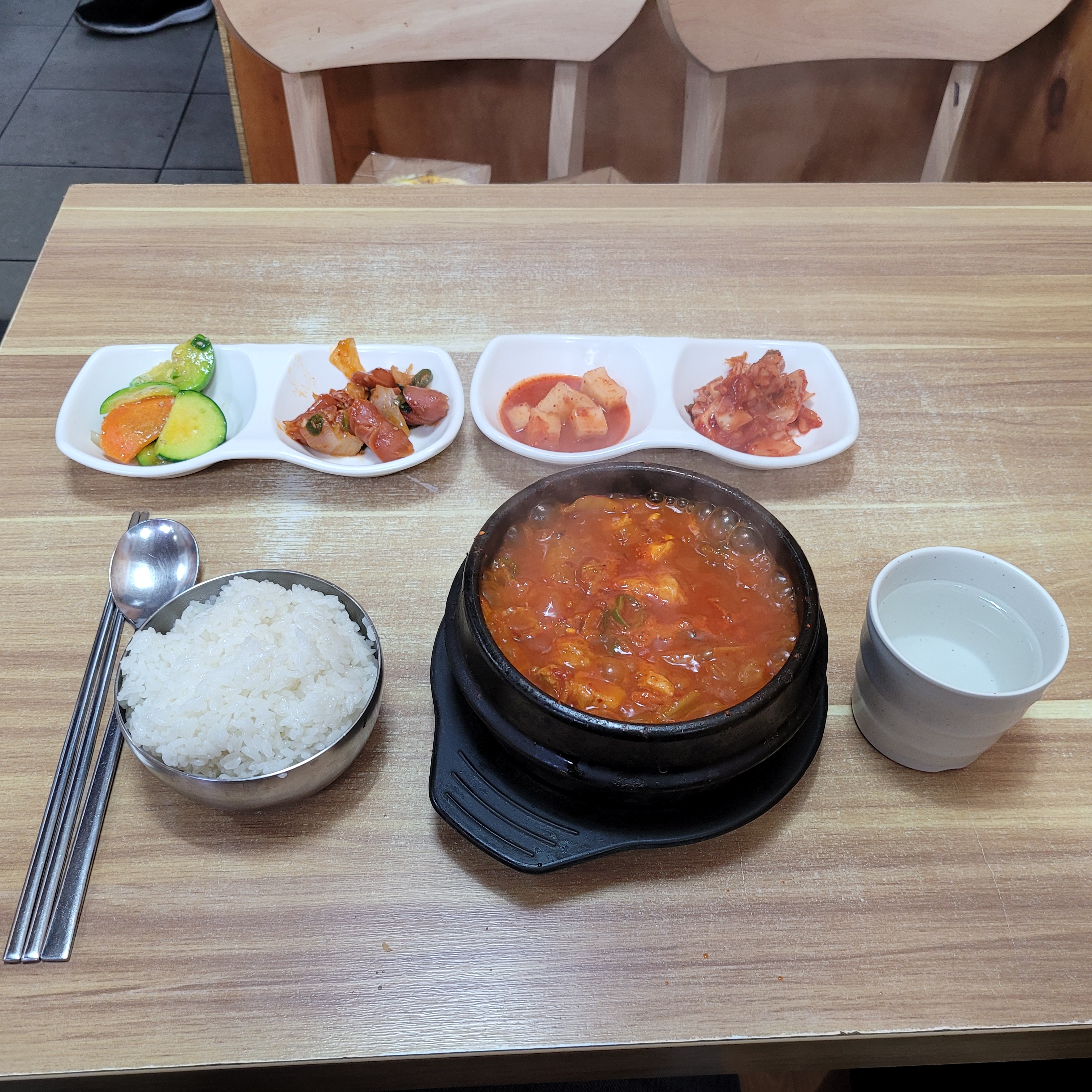 오늘 점심에도 돼지김치찌개를 먹었는데 오늘도 식당 안에 사람들이