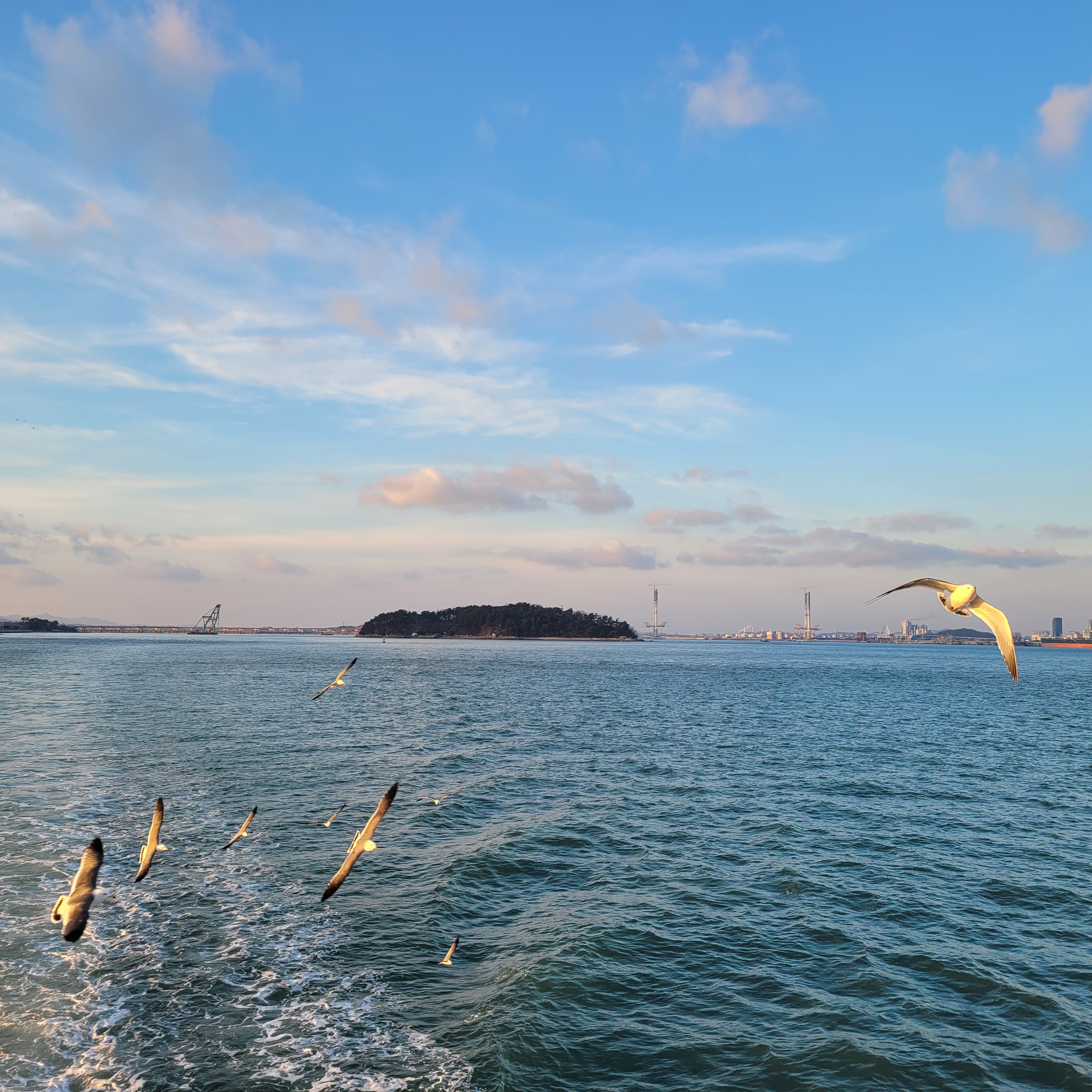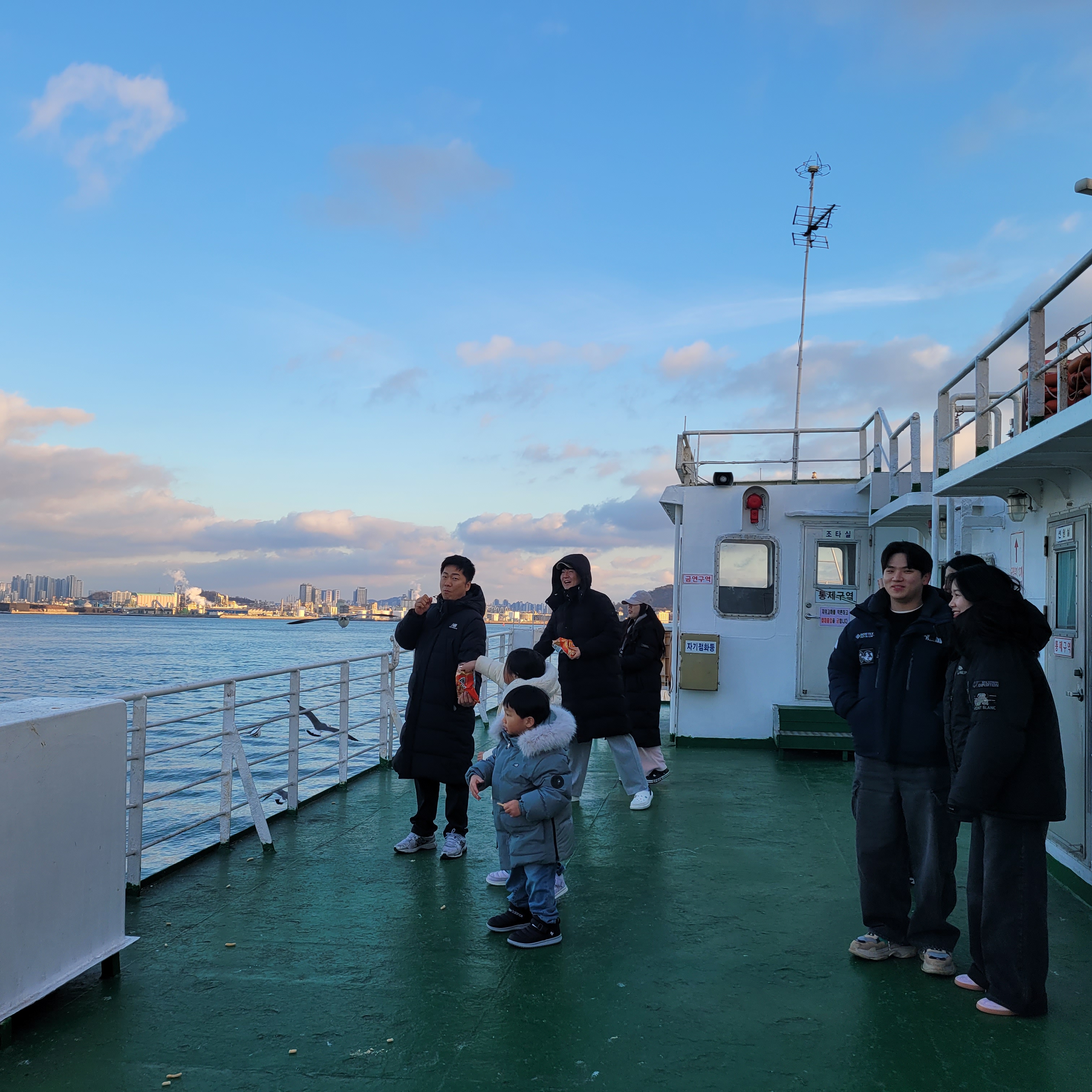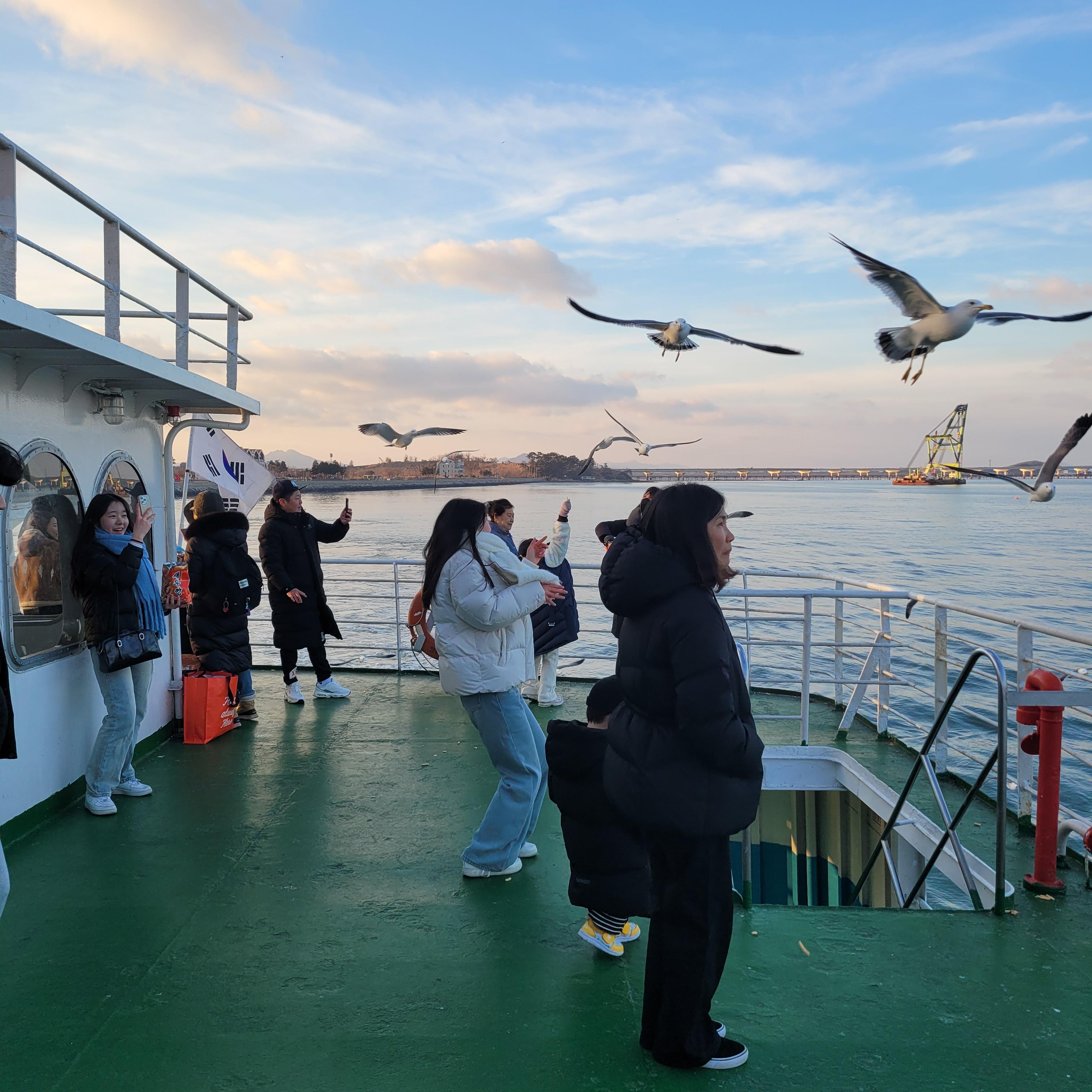 표를 산 뒤에 월미도로 가는 배를 타면서 갈매기들에게 새우깡도 주고